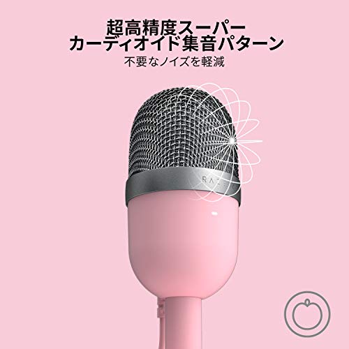 小型コンデンサーマイク (ピンク)・Quartz Pink RZ19-03450200-R3M1・・Style:小型コンデンサーマイク (ピンク)・【クリアなサウンドを届けるコンパクト設計】 Razer Seiren Mini は、超コンパクトなコンデンサーマイクを備え、配信またはビデオ通話環境でプロレベルのオーディオを届けます。・【超高精度のスーパーカーディオイド集音パターン】 このコンパクトなコンデンサーマイクは、マイクの集音範囲が狭いため、声のみを集音でき、優れたアンビエントノイズリダクションを備えているため、タイピングの音やマウスのクリック音といった周辺音を最小限に抑えます。・【プロレベルの録音音質】 14mm コンデンサーカプセルとフラットな周波数特性を備えたこのマイクは、声をより高精度に再現でき、シャープな高音と豊かな重低音により最高の明瞭さで声を届けます。・【超コンパクト & 優れた携帯性】 ミニマリストインテリアや小スペースの環境向けに設計されたこのコンパクトなコンデンサーマイクは、デスクスペースをほとんど取らず環境にさりげなく溶け込むため、ユーザ説明 クリアなサウンドを届けるコンパクト設計 Razer Seiren Mini は、超コンパクトなコンデンサーマイクを備え、配信またはビデオ通話環境でプロレベルのオーディオを届けます。 超高精度のスーパーカーディオイド集音パターン このコンパクトなコンデンサーマイクは、マイクの集音範囲が狭いため、声のみを集音でき、優れたアンビエントノイズリダクションを備えているため、タイピングの音やマウスのクリック音といった周辺音を最小限に抑えます。 プロレベルの録音音質 14mm コンデンサーカプセルとフラットな周波数特性を備えたこのマイクは、声をより高精度に再現でき、シャープな高音と豊かな重低音により最高の明瞭さで声を届けます。 超コンパクト & 優れた携帯性 ミニマリストインテリアや小スペースの環境向けに設計されたこのコンパクトなコンデンサーマイクは、デスクスペースをほとんど取らず環境にさりげなく溶け込むため、ユーザー自身が注目を集めることができます。携帯性にも優れているため、どこでも配信や作業をすることができます。 頑丈なチルトスタンド 頑丈なベース上に配備されたマイクは、声を拾うのに最適なスイートスポットに角度調節できます。さらにマイクを取り外して、ネジ径 5/8 インチのブームアームやマイクスタンドに取り付けることも可能です。 内蔵式ショックマウント 何かにぶつかったり倒してしまったりした場合でも、Razer Seiren Mini の内蔵ショックマウントがこうした振動を吸収し、あなたの配信や聞いている人の耳を突発的なノイズから守ります。 USB プラグアンドプレイ Razer Seiren Mini を USB ポートに接続するだけですぐに使用できます。お好みの配信ソフトウェアまたは音声チャットソフトウェアで音量を調節すれば準備完了で、すぐに使用できます。 付属品 micro USB - USB ケーブル