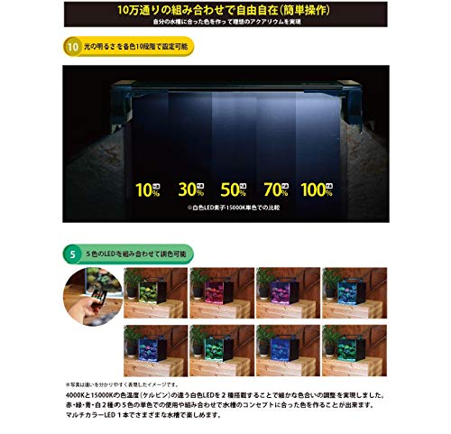 ・300 300 230589・・Size:300・本体サイズ (幅X奥行X高さ) :6.8×30×2.4cm・本体重量:0.2kgリモコン操作で自分の水槽に合った色を最大10万通りの組み合わせの中から作ることができるLED照明です。 調色で迷ったときは事前に登録された5パターンのカラーから簡単に選ぶこともできます。 全灯MAXで最高水準の明るさ 生体がきれいに見える波長を搭載 水草の育成を考えた光を搭載 高さを調節できるリフトアッププラス付き