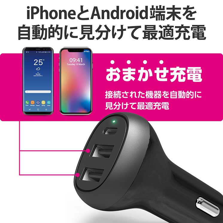 USB Power Delivery規格に準拠したUSB Type-C(TM)(USB-C(TM))ポート1つと、USB-Aポートを2つ搭載し、スマートフォンなどを合計3台充電できる車載充電器。合計最大出力36Wで高速充電が可能。■対応機種:USB Type-C(TM)(USB-C(TM))ポートからUSB Power Delivery(18W)の規格内で充電が可能な機器か最大15W(5V/3.0A)までの出力で充電可能な機器、またはUSB-Aポートから最大18Wまでの出力で充電可能な機器とその組み合わせ ■使用電源:アクセサリーソケット ■コネクタ形状:USB Type-C(TM)(USB-C(TM))ポート×1、USB-Aポート(メス)×2 ■定格入力電圧:DC12V/24V ■定格出力電圧:USB Type-C(TM)(USB-C(TM))ポート:5V/9V、USB-Aポート(メス):5V/9V/12V ■定格出力電流:USB Type-C(TM)(USB-C(TM))ポート:3A(5V時)/2A(9V時)、USB-Aポート(メス):3A(5V時)/2A(9V時)/1.5A(12V時) ■外形寸法:W約30xD約62xH約36mm(突起部含まず) ■質量:約29.5g ■対応ソケットサイズ:Φ20.8mm〜Φ22.0mm ■カラー:ブラック ■発光色:緑 ■保証期間:1年 ■使用可能地域:日本 ■その他:おまかせ充電機能 通電確認LED付き