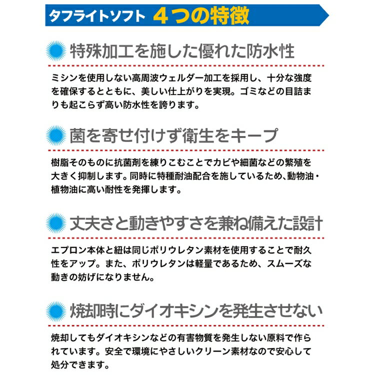 【タフライト ソフトエプロン S ピンク】 ●サイズ:身巾900mmx前中心丈1,000mm ●材質:抗菌配合P/Uフィルム(0.25mm厚) ■特殊加工を施した優れた防水性。 ■ミシンを使用しない高周波ウェルダー加工で抜群の強度と美しい仕上がりを実現。 ■ゴミなどの目詰まりも無く、高い防水性を誇ります。 ■樹脂そのものに抗菌剤を練りこむことでカビや菌などの繁殖を抑制します。 ■特殊耐油配合で動物油、植物油に高い耐性を発揮します。 ■エプロン本体と紐を同じポリウレタン素材を使用することで耐久性をアップ。 ■ポリウレタンは軽量で長時間の作業にも疲れず動作もスムーズです。 ■焼却してもダイオキシンなどの有害物質を発生しない原料で作られています。 ■安全で環境に優しいクリーン素材で安心して処分いただけます。