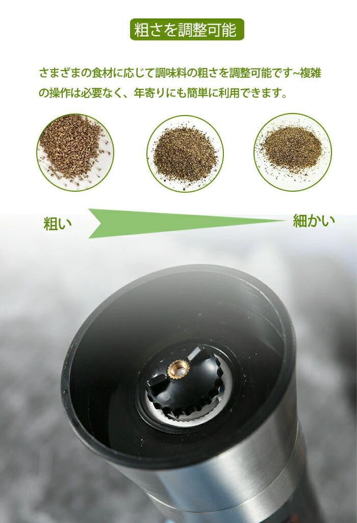 素材:ガラス、ステンレス鋼などカラー:写真の通りセット内容:本体(2本)+ラック容量:約160mlサイズ:6.8cm*14cm生産国:中国自宅に最適なペッパーミル【粗さを調整可能】さまざまの食材に応じて調味料の粗さを調整可能です~複雑の操作は必要なく、年寄りにも簡単に利用できます。【フタ付き】フタ付きなので、使用後フタをカバーしてホコリの侵入を効果的に防ぐことができ、より衛生的です。【長時間使用】セラミック研削ムーブメントを採用して、耐食性、耐摩耗性にも優れます。長時間使用可能で、安全安心。素材:ガラス、ステンレス鋼などカラー:写真の通りセット内容:本体(2本)+ラック容量:約160mlサイズ:6.8cm*14cm生産国:中国自宅に最適なペッパーミル【粗さを調整可能】さまざまの食材に応じて調味料の粗さを調整可能です~複雑の操作は必要なく、年寄りにも簡単に利用できます。【フタ付き】フタ付きなので、使用後フタをカバーしてホコリの侵入を効果的に防ぐことができ、より衛生的です。【長時間使用】セラミック研削ムーブメントを採用して、耐食性、耐摩耗性にも優れます。長時間使用可能で、安全安心。