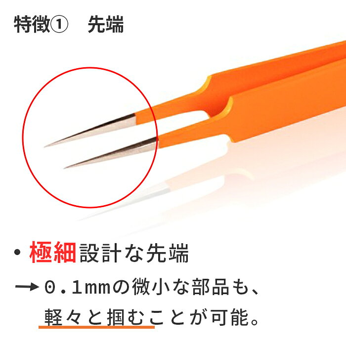 スイス生まれの匠の技が光る、究極の精密ピンセット 精密作業を必要とするプロやクラフト愛好家にとって、なくてはならない存在となるピンセット。RUBIS 5 GRIPは、そんな皆様の期待に応える、まさに究極の逸品です。 特長(特徴) ・驚きの操作性 人間工学に基づいたデザインと厳選された素材で、まるで指の延長のように操ることができます。 ・極細の繊細さ 先端は極細設計で、0.1mm の微小な部品も軽々と掴むことができます。 ・確かなグリップ力 滑りにくい特殊コーティングが施されているため、ピンセットが滑って作業が台無しになる心配もありません。 ・スイス製ならではの高品質 創業100年以上の歴史を誇るスイスの老舗メーカー、RUBIS社が手がける逸品です。 用途 電子機器の修理、精密機械の組み立て、宝石細工、模型製作やその他、繊細な作業が必要とされるあらゆる場面で使用可能です。 人間工学に基づいたデザインと厳選された素材で、驚きの操作性と極細の繊細さを実現します。 仕様 ・素材:ステンレススチール ・全長:115mm ・先端形状:ストレート、カーブ、アングル 注意事項 ・こちらのタイプは超精密ピンセットに分類されており、特に先端は鋭利になっております。そのため、力加減を間違って先端が破損することやつまむ以外で使用して使えなくなることが多いので、取り扱いには十分注意してください。 ・お子様の手の届かないところに保管してください。