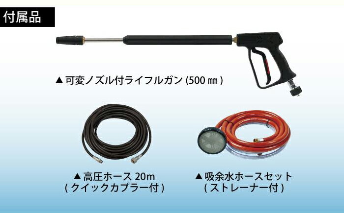 【メーカー直送品■納期都度確認】 ■機能・特徴 ・国内メーカー製エンジン式でメンテナンスも安心 ・自吸方式で水さえあればどこでも洗浄可能! ・積み込みや移動が容易な軽量コンパクト設計 <自吸方式> 水道のない場所でもローリータンクなどに水をためれば、どんな場所でも強力洗浄が可能です。 <楽々移動!> 28.0kg〜50.4kgと超軽量コンパクト設計。1人でも車両への積み込みが可能です。 <楽々積み込み!> 小型車両にも余裕で積み込み可能なコンパクト設計です。 ■用途 ・石垣の苔落としに。 ・建設機械・車両洗浄に。 ・解体現場の粉塵抑制に。 ・大型トラックなどの運搬車両の洗浄に。 ・コンクリート面の土砂汚れ洗浄・劣化塗装の剥離作業に。 ・スズランノズルでの配管洗浄に。 ・トラクターの洗浄に。 ■仕様 ・燃料タンク:3.1L ・吐出水量(L/min):13 ・吐出圧力(MPa):10 ・サイズ(mm):460(幅)×694(奥行)×703(高さ) ・エンジン:空冷4 サイクル傾斜形OHV ガソリンエンジン ・給水方式:自吸式 ・燃料:無鉛レギュラーガソリン ・燃料タンク容量(L):3.1 ・ 総排気量(cc):196 ・回転数(min(の−1乗)):1750 ・質量・質量単位:28.4kg ■セット内容 ・ライフルガンASY 500-クイック ・可変ノズルASY φ1.3 橙 ・高圧ホースASY CL 3/8×20mクイック ・吸水ホースASY 1/2×3m ストレーナー無 ・ストレーナー 円盤形 40メッシュ ・余水ホースASY 3/8×3m テトロンφ10