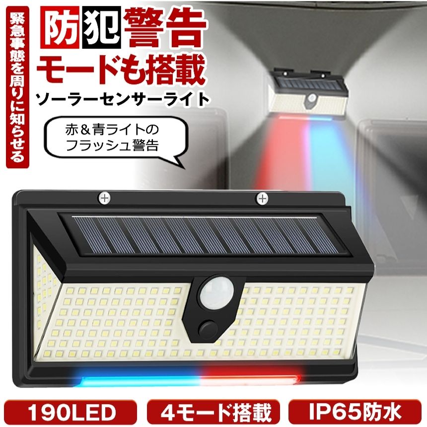 ソーラーライト センサーライト 屋外 防水 ガーデンライト 人感センサーライト 明るい 190LED ソーラーセンサーライト LEDライト 人感センサー 防犯 ライト 防災 LED 夜間 照明 玄関 駐車場 赤 青 点滅 広角