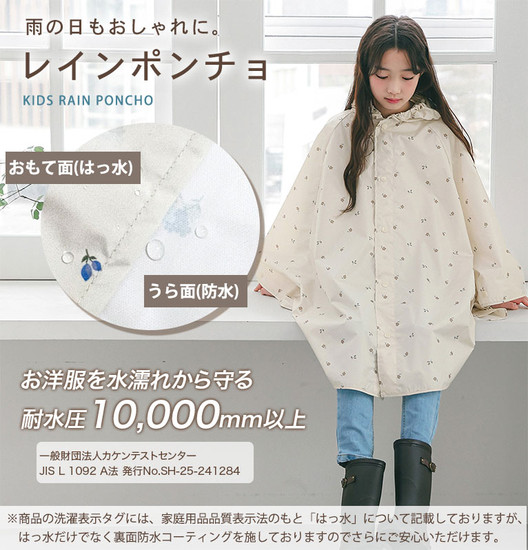 雨の日もおしゃれに可愛く♪さっと着られて便利! お子様の安全と使いやすさを考えたレインポンチョです♪ 【おすすめポイント】 ●生地の裏面は防水TPU加工、表面には撥水コーティング加工を施しているため、水や汚れをしっかりはじきお手入れがラク! ●リュックや通園カバンを背負ったまま着用可能だから、さっと着られてカバンなども濡れません。 ●フードは透明窓付きなので視界良好。首元にはゴムが入っているため、風がふいても脱げにくい仕様になっています。 ●袖部分にはスナップボタン・指穴用のゴムが付いているので、袖を通して着られめくれにくくなっています♪ ●後ろには長めに入った反射テープ付きだから、暗い夜道も安全に歩行できます。 ●汚れたら手洗いが可能なため、いつでもキレイにお使えいただけます。 ●ポンチョと同じ柄の持ち運びに便利な収納バッグ付き! 【サイズ】 S(110-120cm) M(130-140cm) L(150-160cm) 【素材】 ポリエステル 100% 生産:中国 ※裏面の防水コーティングは継続使用により防水機能が低下することはありませんが、表面のはっ水性能は摩擦やお洗濯により低下します。 洗剤や洗濯機は使用せず、こすらずにやさしく手で押し洗いしてください。 表面のはっ水効果が弱くなりましたら、クリーニング店でのはっ水加エまたは市販のはっ水スプレーのご使用をおすすめいたします。 ※お届け時は折りたたんだ状態でお届けしますので、シワがついている場合がございます。広げてハンガーにかけていただくか、またはお使いいただいているうちにシワは取れますのでご了承下さい。 ※アイロンの使用は裏面の防水コーティングが溶ける可能性があるため推奨しておりません。 ※レインウェアとしてのはっ水性能基準をクリアしておりますが、完全防水ではありませんので予めご了承ください。 ※ご覧になるモニター画面の種類により若干色味が異なる場合がございます。お届けする商品は画像と同じものですので予めご了承いただけますようお願い申し上げます。 関連ワード レインコート レインウェア キッズ ランドセル 収納バッグ 通学 男の子 女の子 カッパ アウトドア 子ども 子供 無地 かわいい 可愛い シンプル おしゃれ 遠足 梅雨 雨 雨具 雪 登山 小学生 小学校 対策 梅雨対策 柄 男女兼用