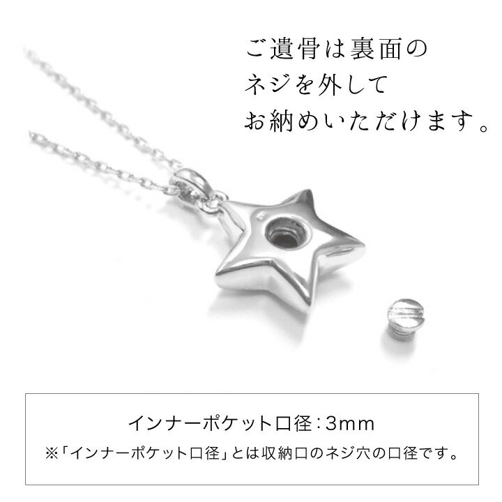 ※関連ワード:ペット用 ペット 手元供養 ペット供養 ペット仏壇 ペット仏具 メモリアル メモリアルグッズ 虹の橋 供養 火葬 動物 犬 猫 うさぎ 鳥 小鳥 人気 思い出 ペットロス ペットロス症候群 お供え かわいい おしゃれ 四十九日 一周忌 お盆 お彼岸 盆 彼岸 手作り 祈りの場 納骨 収骨 分骨 散骨 粉骨 火葬 カロート ミニ ペット ソウルジュエリー 形見 遺品いつもいっしょだから、輝ける。大切なペットちゃんを想う心を、ジュエリーに込めて。あなただけの想いを大切に収納して身につけられる[インナーポケット機能]付きジュエリーです。 納められる遺骨の量は、おおむね耳かき1杯分程度です。 専用器具が付属していますので、どなたでも簡単に遺骨を納められます。 ◇デザインの特徴◇ 輝くお星さまをかたどったシンプルで可愛いデザインが特徴です。国内のジュエリー職人が1点ずつ丁寧にお作りしています。普段使いに適した長めのチェーンは、服の上からも身につけられるため、日常生活の中で大切なペットちゃんをそばに感じることができます。星の形をしたヘッドは、控えめながらもおしゃれで、手元供養やメモリアルジュエリーとして最適です。 シリーズ一覧 シルバー イエローゴールド ローズゴールド ソウルジュエリー 一覧を見る ≫ Q&A ■遺骨はどうやって納めるのですか?専用のドライバーとロートを一緒にお届けします。ジュエリーにねじ式やキャップ式の蓋がありますので、ロートを使ってお骨をお納めください。 ■遺骨以外のものは納めてはいけないのですか?ペットちゃんの毛や小さな爪など、小さな遺品をお納めいただいても大丈夫です。 ■遺骨はどのくらい入りますか?ジュエリーの種類やお骨の様子にも寄りますが、おおむね耳かき1杯分程度です。 大切なペットちゃんと、もっと一緒にいたい、近くにいて欲しい……。そんな想いを叶えてくれる、ご遺骨や遺灰を納めるジュエリーです。霊園などに納骨・埋葬をする前や、お庭などに埋める前に、そっと遺骨や毛をペンダントに納めて、身近においてあげてください。きっと、共に過ごした家族やパートナーを、見守り癒してくれるはずです。お骨を入れる際に使うロートなども一緒にお届けしますので、はじめての方でも安心です。いつも一緒に、これからも一緒に居たいという気持ちを形にしながら、ペットちゃんに見守られるあたたかさと絆を感じてください。 商品名 遺骨ペンダント Soul Jewelry スター シルバー925 商品番号:f00430 サイズ/重量 ・H20 × W14× D5 mm ・チェーン:最大約50cmまで調整可能(シリコンアジャスター付き) ・インナーポケット口径:3mm(※「インナーポケット口径」とは収納口のネジ穴の口径です) ・トップの石:ダイヤモンド 0.01ct(1.3mm) 備考 ■国産(日本製) ・ジュエリーは手作業で1点1点お作りしています。多少の個体差が出ます。写真の色あいは、実際のものと異なる場合があります。あらかじめご承知おきください。 ・防水仕様ではございませんので、水がかかるような場所でのご使用はおやめください。 付属品:個装箱、納骨キット、専用ドライバー、竹製ピンセット、敷き紙、紙製ロート、お手入れクロス、取扱説明書 ※ネジは、ゆるんだり、外れたりするおそれがあります。ご心配な方は固着剤を少量ネジ部に付けて固定させてください ディアペットの遺骨ジュエリー特集ページはこちら▼ 「大切なものだから実物を手にとって選びたい」そんなご家族さまのために、東京・四ツ谷に実店舗(遺骨ジュエリー専門店)がございます。<ご案内はこちら>
