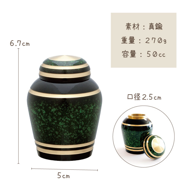 シンプルミニ骨壷 エバーグリーン 大切なペットちゃんのご遺骨や毛、歯をおさめるミニ骨壷です。やわらかな曲線と落ち着いたたたずまいが、大切なペットちゃんを包みます。 やわらかな曲線と落ち着いたたたずまいが、大切なペットちゃんを包みます。 あの子に似合うカラーのミニ骨壷を、手のひらですっぽり包み込めば、 ペットちゃんを抱きしめるようにして慈しんでいただけるはず。 姿かたちが変わっても、「触れ合えている」と実感できたなら、とても嬉しいですよね。 270gと、小さめのりんご1つ分ほどのしっかりした重量ですので、あの子の存在感もきっと感じられるはず。 たとえば、「今のところ白い骨壷のままで置いていて、お祈りしたりもするけど、 なんだかまだ寂しい…」という風にお思いの方へ、 お骨を少しだけちいさな割れない骨壷に移して、より気軽に触ったりしてあの子に想いを馳せる…… そんな「手元供養」という供養のスタイルもおすすめですよ。 生前そうしていたように、リビングやお部屋でソファなどに座りながらあの子を撫でたり、 一緒にお出かけをすることもできます。 専任のデザイナーがデザイン。さらに数十のサンプルより商品となるデザインを厳選しました。 型から抜いたミニ骨壷の生地を削り出します。左側は削り前、右側は削り後。光沢の違いをご覧ください。 職人が1つ1つ想いをこめて手作りした、なめらかな触り心地です。 金属製の骨壷は、冷たくて悲しくなりそう…とお思いの方もいらっしゃると思いますが、 ディアペットの店舗では「地震の時や、台風・豪雨での避難の時などに、仮に落としてしまっても割れたり中身が出てしまったりする心配がないから選びました」という方も増えています。 大事なペットちゃんのために、たくさんの商品の中から納得できるご供養品をお選びくださいね。 アイテム名 シンプルミニ骨壷 エバーグリーン 商品番号(お問い合わせコード):o-sp064 商品詳細 ■サイズ:(外寸)直径5cm×高さ6.7cm、口径2.5cm ■重量:270g ■容量:50cc ■材質:真鍮 ■塗装:ウレタン塗装 底面にはフェルトが貼られており、置く場所に傷をつけません。 ご使用方法 小さな歯や毛、ご遺骨はそのままお納めください。 納まるお骨がないときは、小さめのお骨を選んで、紙に挟んでそっと押してつぶしてください。 ディアペットでは ペットちゃんのお骨のパウダー加工も 承っております ↓↓↓ ※防水仕様ではございませんので、水がかかるような場所でのご使用はおやめください。 ※しっかりと閉まるねじ式の骨壷です。もし外れないかご心配な場合は、ねじ蓋部分を接着剤で固定なさってください。 関連ワード:ペット用 ペット 手元供養 ペット供養 ペット仏壇 ペット仏具 メモリアル メモリアルグッズ 虹の橋 供養 火葬 動物 犬 猫 うさぎ 鳥 小鳥 人気 思い出 ペットロス ペットロス症候群 お供え かわいい おしゃれ 四十九日 一周忌 お盆 お彼岸 盆 彼岸 手作り 祈りの場 ペット骨壷 ペット骨壺 骨壷 骨壺 ミニ骨壷 小さな骨壷 入れ物 ケース メモリアルボックス モダン 納骨 分骨 収骨 火葬 国産 日本製 シンプル モダン スタイリッシュ シンプルミニ骨壷シリーズ ●分骨はどうしよう ペットの遺骨をばらばらにしちゃうなんてかわいそう、供養にならないのではないかしら?と不安に思われる方もいらっしゃるかもしれませんね。 仏教の考えでは、分骨は決して間違ったことではありません。 お釈迦様が亡くなったとき、8人の弟子に分骨をし、この8つに分けた骨が、やがて八大霊塔に祀られ、これが寺院の起源になったと伝えられています。 また、地域によっては分骨が習慣化されているところもあります。 ペットの分骨に関して特別な手続きや法律上のきまりもありませんから、分骨に関して不安に思う必要はなさそうですね。 一番大切なのは、ペットちゃんを供養したいというお気持ちです。カプセルに納めて持ち歩いたり、小さな骨壷に納めてお部屋で一緒にすごすのも良いでしょう。 ●納骨はどうしよう ペットちゃんのご遺骨を手元に残されている方は多くいらっしゃいます。 上記のように一部のみ残す方もいらっしゃれば、骨壷ごとお手元で供養される方もいらっしゃいます。 また、人間同じように四十九日に納骨したり、お誕生日や思い出の日に納骨するもありますし、 火葬後すぐに合祀埋葬するなど、さまざまな方がいらっしゃいます。 つまり、納骨に関しても、こうしなければならない、これが正しいということはありません。 ペットちゃんも、飼い主さんがしたいようにしてくれたほうが喜ぶのではないでしょうか? お家でご安置される場合には、覆袋を可愛いものにしたり、骨壷ごと納まるお仏壇を用意する方もいらっしゃいます。 思い出の写真と一緒にお部屋に置いておくだけでも素敵です。また、お庭に小さなペット墓を建てる方も。 手元に置いておきたいときは一緒にいてあげて、もし納骨したくなったら 、お近くの霊園さ