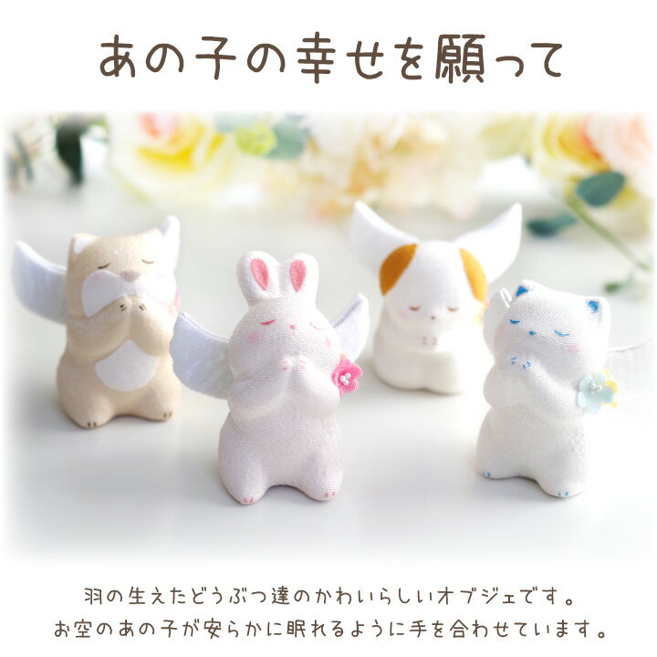 ペットちゃんにそっと寄り添う お祈り天使 羽の生えたどうぶつ達のかわいらしいオブジェです。お空のペットちゃんが安らかに眠れるように、手を合わせてお祈りしています。祈りの場にお供えすれば、大事なペットちゃんにそっと寄り添います。 ■撮影に使用した仏具 ・メモリアルクッション…ペットちゃんのお写真で作る、世界で一つのメモリアルクッションです。ご自宅ではもちろん、大切な方への贈り物としてもおすすめです。 ・ペット仏壇 クリメイションハウス…大切なペットの骨壷を納めるお家型仏壇。ペット仏壇には見えないかわいいデザインだから、ペットちゃんもきっと喜んでくれるはず。 ・グラデーション仏具セット ピンク…小さめのペット仏壇にも合わせやすい、お色も大きさも可愛い仏具セットです。 ・位牌敷 キャンディ…ペットちゃんのお位牌のためにお作りしたドットのチュールとパステルカラーがかわいいオリジナルの敷物です。仏具のマットしてもおすすめです。 ■撮影に使用した仏具 ・仏具セット「まどか」…どんな場所にもマッチする、モダンで美しいシンプルな仏具セットです。祈りの場を森のようにやさしい空気で満たします。 ■撮影に使用した仏具 ・きらきらサンキャッチャーのお供えソープフラワー…石鹸でできたソープフラワーのかわいいオブジェ(お供え置き物)です。お手入れの手間がないので、お悔やみの贈り物にもおすすめです。 ■撮影に使用した仏具 ・パステル仏壇…大きなペット骨壷もおさまる、ゆったりサイズのペット仏壇です。 ・ぬいぐるみ骨袋…かわいくてしっかりとしたペットちゃん用の骨袋です。本物のぬいぐるみのように、触り心地のいいふわふわとした起毛素材で出来ているので、きっと愛着を持っていただけるはず。 ■撮影に使用した仏具 ・クリスタル位牌 フラワーインハート…ハートとお花をモチーフにした、とっても可愛らしい人気のデザインのお位牌です。 ペットロスの心を癒す「虹の橋のお話」詳しくはこちらのページでご案内しています> 羽の生えたどうぶつ達のかわいらしいオブジェです。 お空のペットちゃんが安らかに眠れるように、手を合わせてお祈りしています。 祈りの場にお供えすれば、大事なペットちゃんにそっと寄り添います。 ペットちゃんの穏やかな笑顔を思い浮かべて、思い思いにご供養の場をお作りください。 - アイテム名 - お祈り天使 種類:わんちゃん(立耳)、わんちゃん(たれ耳)、ねこちゃん、うさぎちゃん 商品番号(お問い合わせコード):f00ry010 - サイズ・素材 - サイズ:高さ 約7.5cm×横幅 約9cm×奥行き 約6cm 素材:レーヨンちりめん - 備考 - ■国産(京都製) ※人の手でひとつずつ作っているため、色味や形の違い、ゆがみなどがある場合がございますが、すべて良品ですので安心してお供えください。 関連ワード:メモリアルグッズ 虹の橋 火葬 動物 犬 猫 ねこ ネコ うさぎ 兎 人気 思い出 ペットロス症候群 お供え おくやみ お悔やみ 可愛い かわいい おしゃれ 四十九日 一周忌 お彼岸 彼岸 手作り 祈りの場 モダン リビング ディアペット 簡単 手軽 民芸 手作り ハンドメイド 工芸 日本製 贈り物 プレゼント ギフト 亡くなったペット オブジェ 置き物 置き型 飾り物 マスコット 張り子 あす楽 あすつく 即日 翌日 急ぎ こちらもおすすめです お線香やろうそく、お花、仏具など…ご友人やお知り合いのペットちゃんが亡くなった時に、お悔みのしるしとしてお贈りするのにふさわしいご供養品をご紹介しています。 あの子そのものとしてずっと大事にしていただけますよう、豊富な種類をご用意しています。 ペット仏壇とペット仏具のお得なセットもご用意しています。はじめてでも安心して、届いたらすぐにご供養していただけます。 手作りのぬくもりのある「ちりめん細工」で、大事なあの子をご供養ください。 メモリアルグッズ 一覧はこちら > ペット仏具 一覧はこちら > カテゴリ一覧へ > ディアペットTOPページへ >