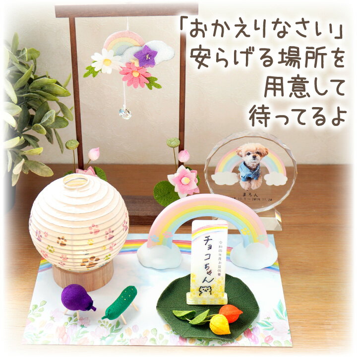 ペットちゃん用「虹の橋お盆お迎えセット」 【ディアペットオリジナル】かわいいちりめん細工のお飾りと、お盆のご供養品をセットにしました。普段の祈りの場にもプラスしやすい内容です。思い思いにお盆の祈りの場を用意して、ペットちゃんをお迎えください。 今年も会える・・・そんな季節がやってきます。 日本の素晴らしい風習の一つでもある「お盆」。 お盆は旅立ったペットちゃんが帰ってくる、大切な期間でもあります。 ペットちゃん達が迷わずにお家に帰ってきて、たくさん楽しい時間を過ごした後、 本来いるべきお空に戻ってまた安らかに過ごせるように あたたかな祈りを込めて、迎え盆・送り盆をしましょう。 ペットロスの心を癒す「虹の橋のお話」詳しくはこちらのページでご案内しています> こちらのセットは、かわいいミニサイズのちりめん細工のお飾りをメインに、 虹の橋オブジェなどの普段使いもできるご供養品と お盆供養にお役立ていただけるご供養品を合わせてお届けします。 どなたさまでも、どんなペットちゃんにもお使いいただける安心のセットです。 付属のポストカードは、ペットちゃんへのメッセージをご記入いただき ディアペット東京(実店舗)までお送りいただきましたら、 お盆の供養セレモニーにてご住職により祈り・お経を捧げ、 お焚き上げをしてお空へメッセージをお届けいたします。 溢れる想いがあるからこそ、「お盆までに送れなさそう…」 そんな方もきっといらっしゃいますよね。 もしもお盆供養祭に間に合わなくても必ずお祀りし、祈りを捧げますので、ご安心くださいませ。 (いただいたポストカードをお祀りしている供養祭の様子はSNSやメールマガジンなどでもご紹介いたします) 虹のオブジェや枠のお飾りは、お盆の後も祈りの場へお飾りいただけます。 明るい虹色が、あの子の祈りの場をきっとかわいくしてくれますよ。 思い思いにお盆の祈りの場を用意して、ペットちゃんをお迎えください。 お盆用品 一覧はこちら アイテム名 ペットちゃん用「虹の橋お盆お迎えセット」 商品番号(お問い合わせコード):f00ta01set8 セット内容 ■計10点セット 1.お名前立て札 2.お盆供養ポストカード 3.虹の敷き紙 4.虹の橋 陶器オブジェ(無地or足あと柄) 5.ちりめん 虹のお花の枠飾り 6.ちりめん 精霊馬(きゅうりの馬) 7.ちりめん 精霊馬(なすの牛) 8.ちりめん ほおずき 9.ちりめん 蓮の葉 10.お清め塩 ポストカードのご祈祷について ペットちゃんへのメッセージをお書きいただき、印刷された住所(ディアペット東京)へお送りいただきましたら、2025年8月9日(土)のオンラインお盆供養祭にてお祀りし、「横田晴正 住職」がご祈祷いたします。 ⇒詳細はこちら ※ご祈祷ののち、曹洞宗 長福寺(新潟県長岡市)にてお焚き上げいたします。お焚き上げ証明書などの発行・発送はございません。 ●ポストカードについて ※投函する際には切手が必要です。 ※2025年8月9日(土)以降の到着分は、「虹の橋みんなの供養祭(月例供養祭)」にてご祈祷ののち、随時お焚き上げいたします。 ⇒【お盆供養祭】について詳しくはこちら 備考 ■ちりめん細工:国産(日本製) 天然素材を使用しているものや、人の手でひとつずつ作っているものが多数ございます。 そのため、色味や形の違い、ゆがみ、ささくれなどがございますが、すべて良品ですので安心してお使いください。 ※お手元に届いた際には、お早めに開封し中身をご確認下さい。 関連のお品物 ⇒「ちりめん 虹のお花の枠飾り」単品 ⇒「ちりめん 精霊馬・蓮の葉・ほおずきセット」単品 ⇒「お盆お迎えトータルセット」 こちらもおすすめです ※関連ワード:メモリアルグッズ 虹の橋 火葬 動物 犬 猫 ねこ ネコ うさぎ 鳥 小鳥 文鳥 はりねずみ ハリネズミ 兎 フェレット モルモット デグー 亀 人気 思い出 ペットロス症候群 お供え 可愛い かわいい おしゃれ 四十九日 一周忌 お盆 お彼岸 盆 彼岸 手作り 祈りの場 亡くなったペット ペット仏具 初盆 新盆 お盆飾り 省スペース モダン リビング アパート マンション 軽い オリジナル ディアペット dearpet ほおずき 法月 鬼灯 蓮 ロータス 蓮華 ハスの葉 枠飾り f00ry028 f00ry029 置き物 飾り お盆用品 精霊馬 はじめて 初めて 簡単 手軽 お焚き上げ お盆セット 220420