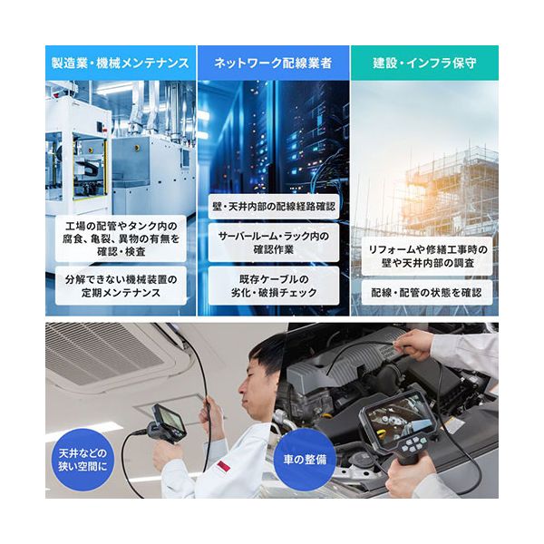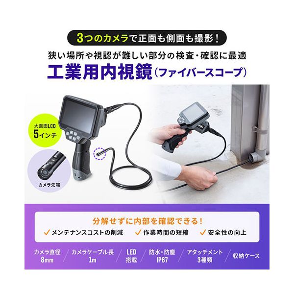 ■商品内容●床下や狭い空間等を撮影する事のできる工業用内視鏡 ●従来の工業用内視鏡は先端にカメラが1つ搭載されている仕様が一般的ですが、先端のカメラに加え側面にも2カメラを搭載しており、モニターでカメラを切り替え撮影が可能です。 ●5インチの大画面LCDを搭載。細部まで鮮明に確認でき、作業効率が向上します ●先端のカメラ径は汎用的に使いやすい直径8mmのカメラを採用 ●カメラのセンサーは1280x720の高解像度仕様。動画も綺麗に撮影できます。 ●カメラの先端にLEDを搭載しており、暗いところでも明るく撮影できます。 ●MicroSDを入れると映像を録画できます。 ●カメラの先端及びチューブ部分はIP67の防塵防水設計。 ●繰り返し充電できるリチウムイオン電池を内蔵。■商品スペック■カメラ種別 : その他 カメラ部 ■カメラ径 : 8mm ■カメラケーブル長 : 1m ■イメージセンサー : CMOS ■カメラ画素数 : 1280x720 ■防水規格 : IP67 モニター部 ■モニターサイズ : 5インチ ■モニター解像度 : 854x480 ■撮影解像度 : 1920x1080※デジタル補間、1280x720 ■倍率 : デジタルズーム最大4倍 ■対応SD : SDXC 最大256GBまで対応 ■電源 : 内蔵充電電池 ■充電時間 : 約5時間 ■動作時間 : 約5時間 ■付属品 : 本体(モニター部)、カメラ、マグネット、フック、ミラー、充電ケーブル(タイプC - USBA)、専用ハードケース■送料・配送についての注意事項●本商品の出荷目安は【4 - 7営業日 ※土日・祝除く】となります。●お取り寄せ商品のため、稀にご注文入れ違い等により欠品・遅延となる場合がございます。●本商品は仕入元より配送となるため、沖縄・離島への配送はできません。