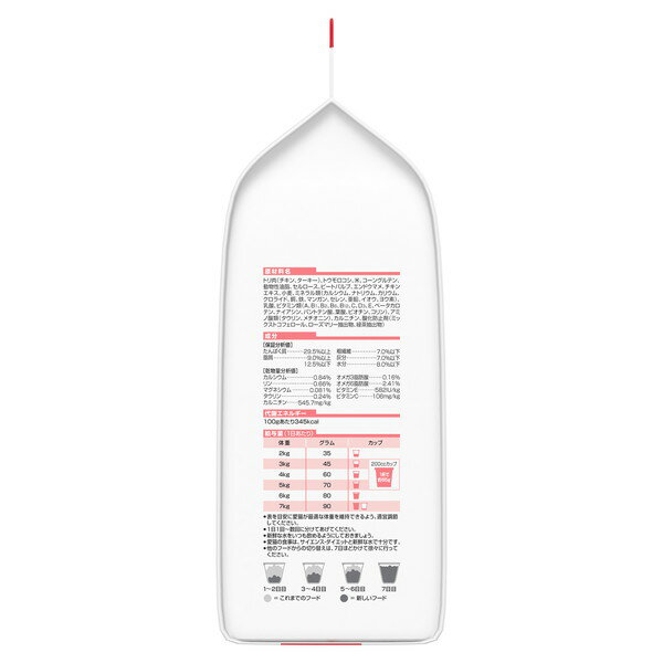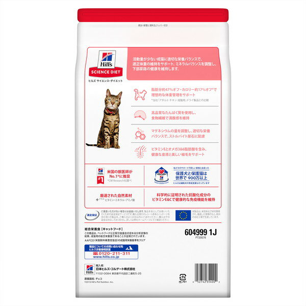 活動量が少ない成猫に適切な栄養バランスで、適正体重の維持をサポート ・脂肪分約47%オフ・カロリー約17%オフ※で理想的な体重管理をサポート ・高品質なたんぱく質を使用し、食物繊維で満腹感を維持 ・マグネシウムの量を調整し、適切な栄養バランスで、ストルバイト尿石に配慮 ・ビタミンEとオメガ3&6脂肪酸を含み、健康な皮膚と美しい被毛をサポート ※ヒルズ「アダルトチキン成猫用」ドライ製品との比較 【原材料】 トリ肉(チキン、ターキー)、トウモロコシ、米、コーングルテン、動物性油脂、セルロース、ビートパルプ、エンドウマメ、チキンエキス、小麦、ミネラル類(カルシウム、ナトリウム、カリウム、クロライド、銅、鉄、マンガン、セレン、亜鉛、イオウ、ヨウ素)、乳酸、ビタミン類(A、B1、B2、B6、B12、C、D3、E、ベータカロテン、ナイアシン、パントテン酸、葉酸、ビオチン、コリン)、アミノ酸類(タウリン、メチオニン)、カルニチン、酸化防止剤(ミックストコフェロール、ローズマリー抽出物、緑茶抽出物) 【保証成分】 たんぱく質29.5%以上、脂質9.0%以上12.5%以下、粗繊維7.0%以下、灰分7.0%以下、水分8.0%以下、カルシウム0.84%、リン0.66%、マグネシウム0.081%、タウリン0.24%、カルニチン545.7mg/kg、オメガ3脂肪酸0.16%、オメガ6脂肪酸2.41%、ビタミンE:582IU/kg、ビタミンC:106mg/kg 【エネルギー】 345kcal/100g 【給与方法】 「1日当たりの給与量目安」 体重2kg:35g、体重3kg:45g、体重4kg:60g、体重5kg:70g、体重6kg:80g、体重7kg:90g ※200ccカップ1杯で約85g ・上記を目安に愛猫が最適な体重を維持できるよう、適宜調節してください。 ・1日1回〜数回に分けてあげてください。 ・新鮮な水がいつも飲めるようにしておきましょう。 ・愛猫の食事は、サイエンス・ダイエットと新鮮な水で十分です。 ・他のフードからの切り替えは、7日ほどかけて徐々に行ってください。 【賞味期限】 20ヶ月 【保管方法】 直射日光、高温多湿をさけて保存してください。開封後はお早めにご使用ください。 【原産国または製造地】 チェコ 【諸注意】 製品により、色、香り、質感等が多少異なる場合がありますが、原材料由来のもので、栄養上の問題はありません。