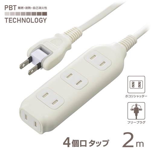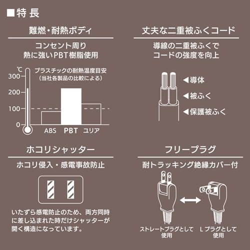 特 徴●ホコリシャッターでホコリ侵入・感電事故防止●耐トラッキング絶縁カバー付きフリープラグ●コンセント周りに熱に強いPBT樹脂を使用した難燃・耐熱ボディ●丈夫な二重被ふくコード仕 様■最大消費電力 合計:1500W■コンセント:4個口■プラグ形状:フリープラグ■コード長:2m