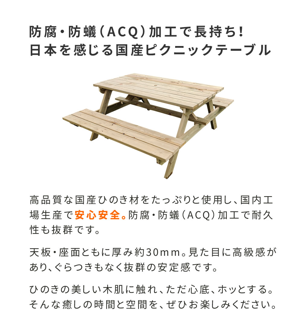 ※北海道・沖縄・離島は別途送料が必要となります。※こちらは国産のひのき材に、防腐・防蟻(ACQ)加工を施したピクニックテーブルになります。塗装は施しておりません。 ※「節あり」グレードの木材を使っているため、節や節穴、割れ、キズのような天然木の特徴を、ありのまま活かした商品になります。 ●防腐・防蟻(ACQ)加工で長持ち!日本を感じる国産ピクニックテーブル 高品質な国産ひのき材をたっぷりと使用し、国内工場生産で安心安全。防腐・防蟻(ACQ)加工で耐久性も抜群です。 天板・座面ともに厚み約30mm。見た目に高級感があり、ぐらつきもなく抜群の安定感です。 ひのきの美しい木肌に触れ、ただ心底、ホッとする。そんな癒しの時間と空間を、ぜひお楽しみください。 ●海外においては20年経っても腐らない実績!※ 耐久性・耐候性に優れた高品質な国産ひのき材と、“ACQ加工”を採用しました。 ※日本は気候風土に違いがあるため、上記年月を保証するものではございません。多少のねじれ、若干の節、変形、割れ、変色などは、自然素材の特徴としてお楽しみください。 ●大人四人がけ ●管理が簡単!テーブル×ベンチ一体型 各スペースのイメージに合ったインテリア好みの テイスト に合わせて、 アフリカン ロココ調 ヴィクトリアン調 ゴシック ジャンク シャビー ナチュラル ポップ ハイカルチャー シック フレンチカントリー シャビーシック 北欧モダン 和モダン モダンクラシック チープクラシック アーバンカントリー デコラティブ キュート クール スタイリッシュ ミニマル ラグジュアリー カジュアル 北欧 ノルディック 西海岸 グランジ かっこいい テイスト レトロ フェミニン ヴィンテージ ビンテージ モダン シンプル フレンチ カントリー アンティーク エレガンス ガーリー ミッドセンチュリー ポップ などのお部屋を彩るインテリアスタイルに合う商品を提供しております。コーディネートには様々なスタイルがありすぎて、いまいちイメージがつかないこともありますので、スタイリッシュ カフェ風 cafe風 カフェ ヨーロッパ クール 北欧家具 デザイナーズ アジアン 民芸調 バリ バリ家具 東南アジア エスニック 姫系 イタリア イタリアン ヨーロピアン トラディショナル エレガンス 和 和風 和室 ジャパニーズ 都会的 欧米 田舎風 モノトーン アーバン エレガント クラシック 優雅 グラマラス 英国風 シック 王室 王室風 貴族 フレンチ 南仏 アメリカン 英国 イングリッシュカントリー リゾート ベーシック アーバンモダン モダンリビング クラシカル 小悪魔 ヨーロッパ風 な伝統や暖かさを取り入れた家具や プリンセス系 プリンセス セレブ 姫家具 白家具 シャビー おしゃれ お洒落 かわいい カワイイ 可愛い Clear クリア 男前インテリア ロココ調 インダストリアル DIY リメイク風 ユーズド風 男前家具 男前 などの代表的なスタイルをまとめてみました。自分の好みがどんなスタイルなのか、イメージがつかめれば模様替えもやりやすいはずです!生活環境や季節に合ったインテリア日本にはたくさんのイベントがありますので、 成人の日 春分の日 みどりの日 こどもの日 海の日 山の日 敬老の日 秋分の日 体育の日 勤労感謝の日 お正月 NEW YEAR 歳末 歳末セール 決算 決算セール ハッピーマンデー 成人式 卒業式 小学校 中学校 高校 大学 入学式 入社式 新卒 新生活 新社会人 社会人 お花見 エイプリルフール ゴールデンウィーク 端午の節句 ホワイトデー バレンタインデー 節分の日 端午の節句 母の日 家事 子育て プレゼント 感謝 梅雨 梅雨前線 雨季 スコール 父の日 七夕 夏祭り 花火大会 花火 お月見 十五夜 運動会 体育祭 紅葉 もみじ狩り 七五三 クリスマス クリスマス・イブ イルミネーション ライトアップ 大晦日 年越し 大掃除 などの イベント にあった インテリア 家具 生活雑貨 DIY 用品 を幅広く取り揃えております。生活の中で贈られる 贈り物 ギフト は、差し上げる時期も大切ですので、 慶事 お祝い事 おめでたいこと 歓び 結婚 結婚祝い 結婚祝いのお返し 結婚記念日 出産 出産祝い 出産祝いのお返し 銀婚式 金婚式 七五三 初節句 七五三のお祝いのお返し 長寿 還暦祝い 古稀祝い 喜寿 傘寿 米寿祝い 長寿祝いのお返し 入園 入学 入学祝い 入園祝い 卒業 卒業祝い 就職祝 就職 就職祝い 栄転祝い 栄転 異動 定年退職御祝い 送別会 定年退職 開店祝い 開業祝い 新築 新築祝い 落成後 病気全快 病気全快祝い お見舞いのお礼 闘病中 見舞 見舞い お年賀 お年玉 お中元 暑中御見舞 残暑御見舞 お歳暮 御歳暮 お見舞い 楽屋見舞 挨拶 手土産 餞別 転職 など 贈り物 プレゼント のシーンにあったラインナップです。新生活 で引っ越しをされる方など ワンルーム ひとり暮らし 1R 1K 1LDK 1DK 2DK 2LDK 2K 3K 3DK 3LDK 4LDK 5LDK 戸建 戸建て 一戸建て ルームシェア ゲストハウス 民泊 シェアハウス 同棲 同居 家族 ふたり暮らし ファミリータイプ 一人暮らし ファミリー 二人暮らし ホテル リラックス 家庭 引っ