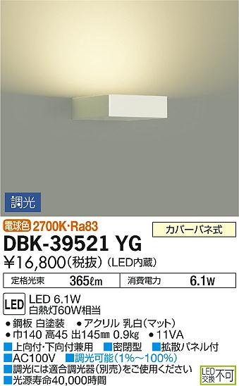 照明 おしゃれ かわいい 屋内 ライト大光電機 DAIKO 調光ブラケットライト DBK-39521YG 白塗装 上向付・下向付兼用 LED電球色 白熱灯60W相当