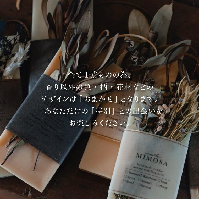すべて1点物の為、香り以外の色・柄・花材などのデザインは「おまかせ」となります。 香りを閉じ込めたアロマワックスにドライフラワーをあしらった、優しい香りを楽しめるブーケ。 「Candle MIMOSA(キャンドルミモザ)」アロマワックスブーケ 全てが手作りで天然素材を使用した一点物の為、全く同じものは一つとして存在しない特別な製品で、百貨店や有名書店などへの出店、キャンドルを使用した店舗ディスプレイやウェディングコーディネートなどを手掛け、注目を集めているブランドです。 優しい香りを纏ったアロマワックスにドライフラワーを組み合わせて、壁に吊り下げるだけでお部屋のアクセントに。 リビング、寝室、玄関、トイレ、クローゼットなど、ウォールデコレーションとしてもホームフレグランスとしても様々な場所に使用が可能です。 吊り下げ用の紐もついているので、届いたらすぐに掛けてお使いいただけます。 北欧、ナチュラル、カントリー、モダン、和モダン、海外風、ボタニカルなど様々なインテリアテイストにマッチします。 シンプルでおしゃれなパッケージ入りで、大切な方へのプレゼントとしてもおすすめです。 香りの持続期間の目安:6ヶ月程 ※環境により前後します。 ————————— 香りの種類 ●Mimosa(ミモザ) 柔らかいパウダリーな香りの奥に青々しい爽やかな香りが広がります。 きつい香りが苦手な人におすすめです。 ●White Musk(ホワイトムスク) 優しい香りにラ・フランスをブレンドしました。 フルーティですっきりした香りです。 ●Honey(ハニー) はちみつの優しい香りにジンジャー・レモンをブレンド。 甘いけれどスッキリとした香りです。 ●Wood(ウッド) ユーカリベースの落ち着きのある森林浴の香り。 男性人気No.1。 ————————— ★無料ラッピング承ります。 新築祝い・引越し祝い・結婚祝い・誕生日プレゼント・送別品・ 出産祝い・記念日・退職祝い・母の日・父の日・クリスマス・お祝い返し・日頃の感謝やギフトにおすすめです。 ※ご注文時、備考欄にラッピング希望の旨をご記載ください。 ※金額が記載された納品書が不要な場合もその旨をご記載ください。 ※大量注文の場合、数量によってはラッピングをお断りさせていただくことがございます。 ————————— 【香料(アロマ)について】 Candle Mimosaで使用している香料は「精油(エッセンシャルオイル)」ではありません。 「精油」は100%自然のもので効能・効果がありますが、人によってはその効果が薬にも毒にも変わります。 Candle Mimosaでは贈り物として、どなたの手に渡っても安全にお使いいただけるよう「合成香料」を使用しております。 ▼キャンドルミモザ のアイコン的なキャンドル▼ ボタニカルアロマキャンドル ▼関連商品 ・カメヤマ キャンドルウォーマーランプミニ+香るキャンドルセット ・KINTO アロマオイルウォーマー ・カラフェディフューザー ・グリーンリーフ フレッシュセンツL ・ポルカ E26クラシックデスクライト ・ポルカ E26 ミニスタンド ホワイト 商品名 キャンドルミモザ アロマワックス ブーケ Candle Mimosa Aroma Wax Bouquet サイズ 約 W70×H165×D60mm 重さ:約130g ※ハンドメイドの為、サイズや重さには個体差がございます。 香り ・ミモザ ・ホワイトムスク ・ハニー ・ウッド 注意事項 ・すべて1点物の為、香り以外の色・柄・花材などのデザインは「おまかせ」となります。 ドライフラワーはデリケートなため、輸送中に葉や花びらに多少の千切れや剥離、こぼれが生じることがございます。 上記理由による返品や交換はお受けできません。 ・ひとつひとつ手作業で制作しています。ハンドメイドという事を理解いただける方のみ購入をお願いいたします。 ・蝋の性質上、高温になると変形や場合によっては溶ける可能性がございます。日差しの強い場所や車内などに置かないようにしてください。 ・小児やペットのそばでの使用、保管はしないでください。 メーカー 株式会社Greige 広告文責 株式会社ディーエムエー TEL:0120-947-057すべて1点物の為、香り以外の色・柄・花材などのデザインは「おまかせ」となります。 香りを閉じ込めたアロマワックスにドライフラワーをあしらった、優しい香りを楽しめるブーケ。 「Candle MIMOSA(キャンドルミモザ)」アロマワックスブーケ 全てが手作りで天然素材を使用した一点物の為、全く同じものは一つとして存在しない特別な製品で、 百貨店や有名書店などへの出店、キャンドルを使用した店舗ディスプレイや ウェディングコーディネートなどを手掛け、注目を集めているブランドです。 優しい香りを纏ったアロマワックスにドライフラワーを組み合わせて、 壁に吊り下げるだけでお部屋のアクセントに。 リビング、寝室、玄関、トイレ、クローゼットなど、ウォールデコレーションとしても ホームフレグランスとしても様々な場所に使用が可能です。 吊り下げ用の紐もついているので、届いたらすぐに掛けてお使いいた