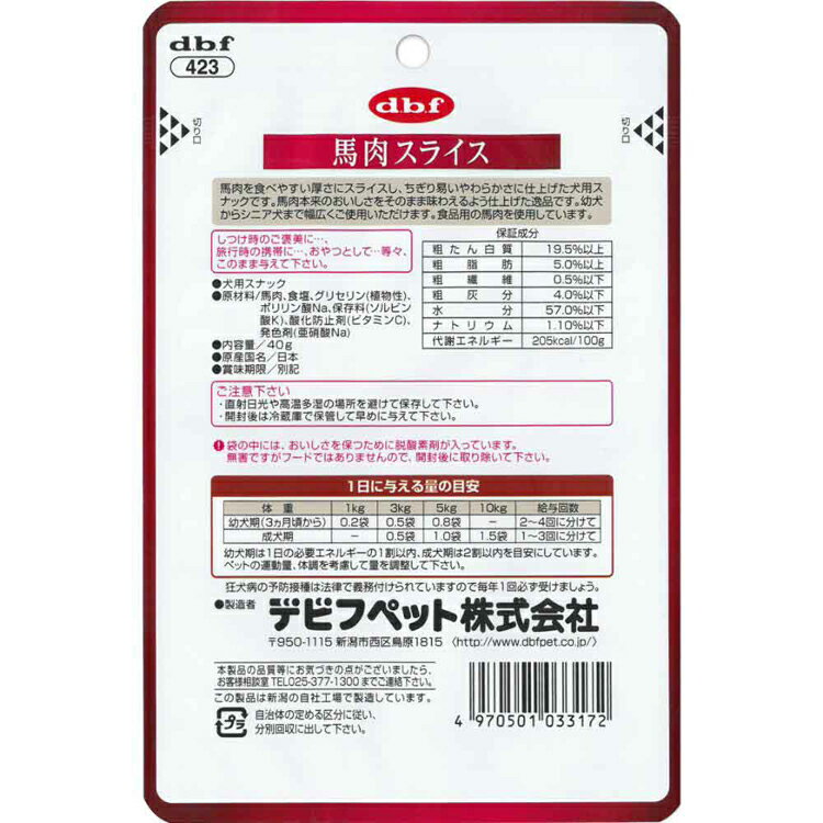 馬肉スライス 40g 423 デビフ d.b.f 犬 いぬ おやつ しつけ 散歩 トリーツ スナック ごほうび 牛肉 幼犬 シニア犬 デビフペット