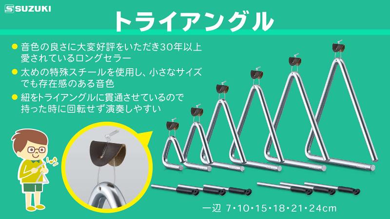 SUZUKI スズキ コンサートトライアングル ST-21鋼に使われる太めの特殊スチールを採用しているので音のダイナミックレンジ(強弱の幅)を広く取れるため、強く鳴らしても弱く鳴らしても、余韻がキレイに残る濁りのない音を実現できています。紐をトライアングル本体に貫通させているので、持った時に本体が回転せず演奏しやすいのも特長です。透明感のある澄んだキレイな音は、演奏会での使用だけでなくリラクゼーションの場で癒しの音としても使われています。専用レザーケース(合皮)付。材質:特殊スチール、特殊焼入 寸法:一辺21cm 重量:537g 付属品:ビーター(SP-410)、レザーケース(合皮)