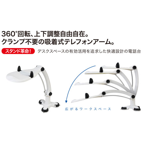 ●360°回転、上下調整自由自在。●クランプ不要の吸着式テレフォンアーム。●デスクスペースの有効活用を追求した快適設計の電話台。●ホルダーを机上15cm〜最高43cmまで調整可能!●特殊吸盤によりシッカリ止めることができる安心設置!●入数:1個●サイズ:幅212×奥行421×高さ476mm●耐荷重:約1kg●JANコード:4974214180208※商品コード:065-01850