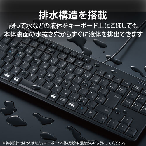 ●メーカー直送品となるため、お客様都合のキャンセルはお受けできません。また、配送希望時間のご指定を承ることができません。●メーカー直送品のため、納品書は同梱されておりません。金額の明記された納品書をご入り用の方はカスタマーセンターまでご連絡ください。●メーカー直送品のため配達地域によって配送業者、送り状番号のご案内が出来ない場合がございます。ご了承ください。●本商品は「分納」商品となります。他の商品と同梱での発送は出来かねますので、ご了承ください。●音が気になる場所や時間帯での使用に最適な有線タイプの静音コンパクトキーボードです。デスク周りのスペースを有効に使えるテンキーレスタイプです。●各キートップに装着したシリコンラバーによって打鍵音を大幅に軽減。公共施設や会議室、夜中や朝方など音が気になる場所や時間帯での使用に最適です。●抗菌加工によって、菌の繁殖を抑え、清潔に保ちます。(抗菌範囲:キーボード筐体、印刷部分)●入数:1個●コネクタ形状:USB(A)オス●キータイプ:メンブレン●キー配列:92キー+9キー(日本語配列)●キーピッチ:19mm●キーストローク:2mm●ホットキー数:9キー●電源方式:USBバスパワー●ケーブル長:1.5m●外形寸法:幅361.6mm×奥行139.8mm×高さ26.3mm(スタンド含まず)、幅361.6mm×奥行139.8mm×高さ34.8mm(スタンド時)●サイズ分類:コンパクト●質量:約360g※ケーブル含む●VCCIclassB対応:○●JANコード:4549550210744※商品コード:122-00126(2)エレコム エレコム直送 フルキーボード 有線 TK−FCM114SKBK(ブラック)