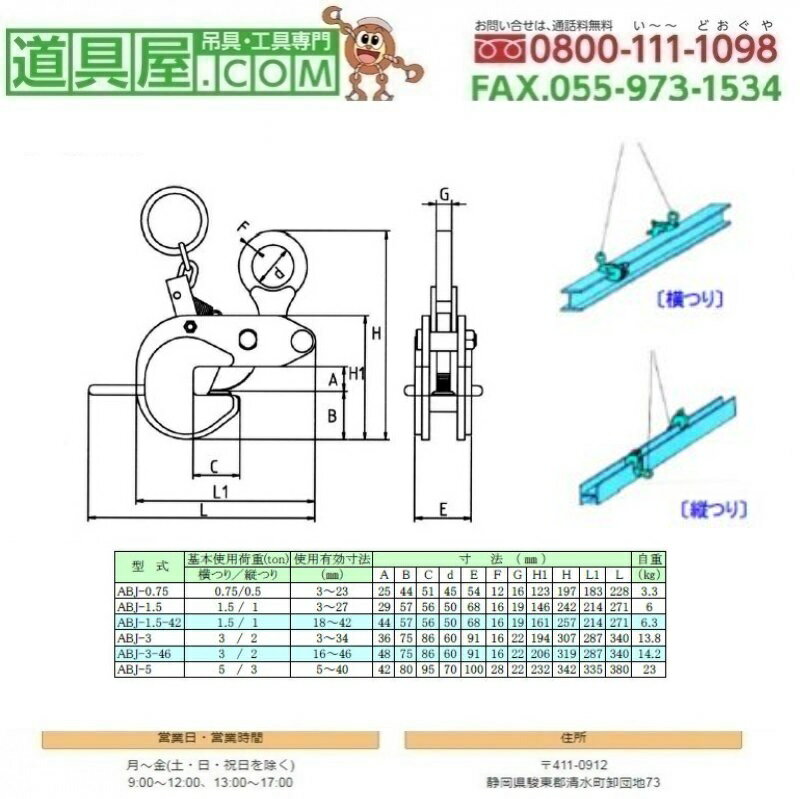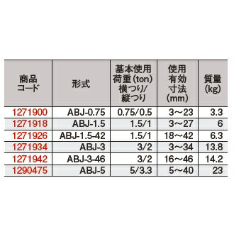メーカー日本クランプ株式会社型番ABJ-3-46仕様●横吊り・縦吊り兼用型クランプ(ABJ型)●使用有効寸法範囲:16~46mm●質量:14.2KG●基本使用荷重:横つり3TON・縦吊り2TON●安全ロック付●2点吊り用特長●横吊り・縦吊り兼用。●反転作業が可能で、そのまま縦吊りも可能です。●容量が大幅にアップしています。(大きさは従来の横吊り型クランプとほとんど変わらず横吊り容量は50%アップです)用途●鉄骨梁等H形鋼の建て方や運搬● 山留材や切張材の横つり・縦つり注意事項● 必ず、2台1組で重心つりをしてください。● カム・ジョーが“B”タイプの場合は、通常のカム・ジョーよりも歯の摩耗が早いので、必ず始業点検の際に摩耗の状態を確認してから使用してください。● 塗装や特殊処理の施されたつり荷には、必ず “S”タイプのカム・ジョーを使用してください。● 取っ手での縦つりはできません。● シートパイルの引抜きには使用できません。● 掛け幅角度・つり角度を厳守してください。生産国日本納期お取り寄せ品の為、入荷次第発送ABJ-3-46