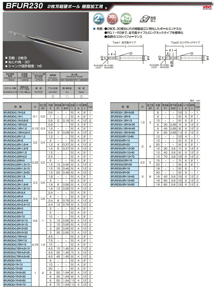 ギガ・セレクション 超硬エンドミル BFUR230-0.25RX1.5X15 (BFU2300.25X1.5X15) (2枚刃超硬ボール 樹脂加工用)