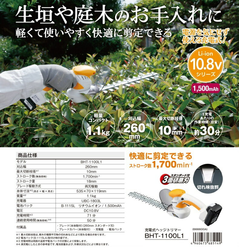 【ポイント5倍】【直送品】 京セラ 充電式ヘッジトリマー BHT-1100L1 (666600A)