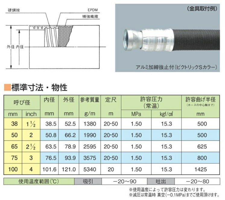 ※北海道・沖縄・離島への配送は、別途送料を申し受けます。《用途》●一般用水・冷却水・汚水用など。●一般工場・土木建設現場・造船などでの送給水用。《特長》●最も耐圧性能が高い耐圧・耐摩耗用サクション・デリバリーホースです。●耐圧・耐摩耗用ホースの中で最も耐圧性に優れています。【配送料について】●大型商品の為、一部配達が出来ない地域や、別途送料が必要な場合がございます。※特に北海道のお客様はご注意下さい。●その場合は、ご注文後にメールで送料を含む合計金額をお知らせ致します。●送料が別途必要な場合は、ご注文後のキャンセルもお受け致します。お気軽にご注文下さいませ。●尚、送料が無料の場合は、そのまま出荷手配をさせて頂きます。【お支払い方法について】●こちらの商品はメーカーからの直送となります。代金引換のお支払い方法はご利用になれません。●代金引換にてご注文頂いた場合はご注文をキャンセルとさせて頂く場合がございますので予めご了承下さいませ。※北海道・沖縄・離島への配送は、別途送料を申し受けます。《用途》●一般用水・冷却水・汚水用など。●一般工場・土木建設現場・造船などでの送給水用。《特長》●最も耐圧性能が高い耐圧・耐摩耗用サクション・デリバリーホースです。●耐圧・耐摩耗用ホースの中で最も耐圧性に優れています。