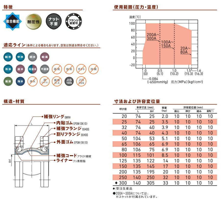 《仕様》●呼び径:125●本体寸法 ・L(mm):135 ・Φd(mm):122●質量(kg):14●許容変位量 ・偏心(mm):10 ・伸び(mm):10 ・縮み(mm):10 ・偏角(°):10●フランジ適合寸法:JIS10KF●材質:SS400《特長》●耐薬品性・耐熱性はフッ素樹脂、振動吸収はゴムが分担し補完しあう複合機能型のフレキシブル継手。●外側がゴムですので、外部からの衝撃を緩和し安心して使用できます。●最高使用温度100℃、しかも接液部はフッ素樹脂のため、流体を汚さず給湯ラインに最適。【お支払い方法について】●こちらの商品はメーカーからの直送となります。代金引換のお支払い方法はご利用になれません。●代金引換にてご注文頂いた場合はご注文をキャンセルとさせて頂く場合がございますので予めご了承下さいませ。《仕様》●呼び径:125●本体寸法 ・L(mm):135 ・Φd(mm):122●質量(kg):14●許容変位量 ・偏心(mm):10 ・伸び(mm):10 ・縮み(mm):10 ・偏角(°):10●フランジ適合寸法:JIS10KF●材質:SS400《特長》●耐薬品性・耐熱性はフッ素樹脂、振動吸収はゴムが分担し補完しあう複合機能型のフレキシブル継手。●外側がゴムですので、外部からの衝撃を緩和し安心して使用できます。●最高使用温度100℃、しかも接液部はフッ素樹脂のため、流体を汚さず給湯ラインに最適。