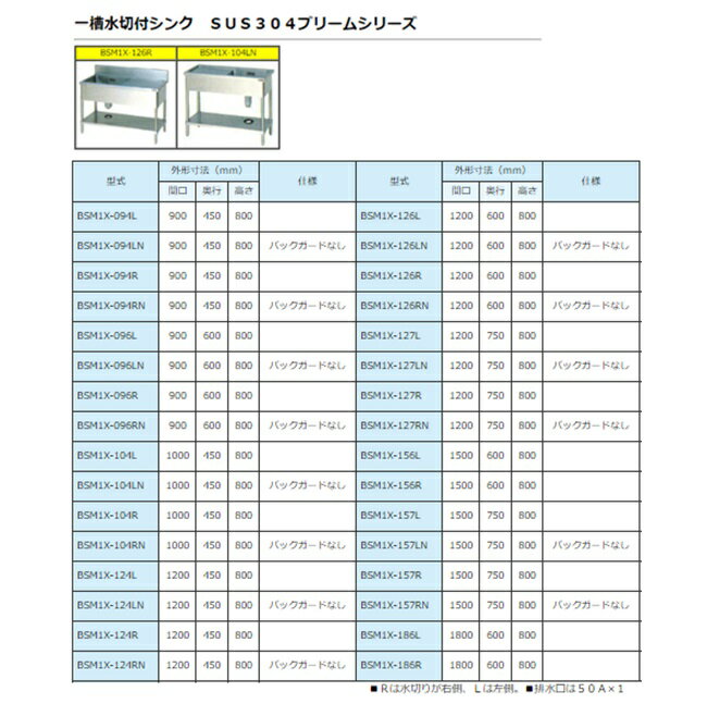 【直送品】 マルゼン 一槽水切付シンク(バックガードなし) SUS304 BSM1X-096LN 【送料別】