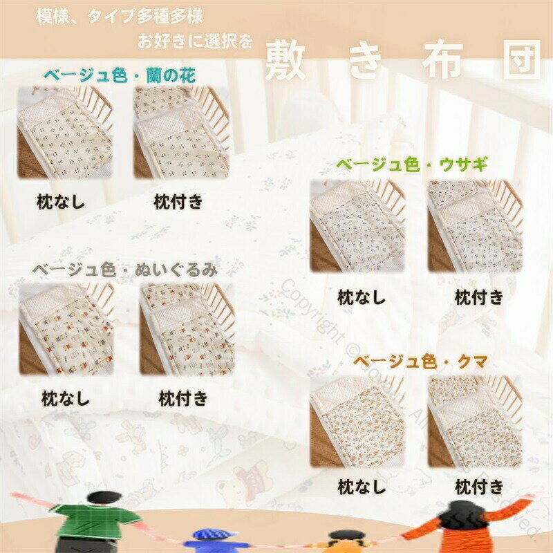 【サイズ】敷き布団:55*100*2cm 枕:30*40*2cm 敷き布団は横がサイズより5cmほど長いことをご注意くだざい。【タイプ】主にベージュ色・ぬいぐるみ(枕なし)、ベージュ色・蘭の花(枕なし)、ベージュ色・クマ(枕なし)、ベージュ色・ウサギ(枕なし)、ベージュ色・ぬいぐるみ(枕付き)、ベージュ色・蘭の花(枕付き)、ベージュ色・クマ(枕付き)、ベージュ色・ウサギ(枕付き) 八つのタイプをお選んでいただきます。◎高質量天然素材:布団のカバーは綿100%生地で、いつでもやさしい寝心地!通気性にも優れているので、暑がりな赤ちゃんにもピッタリです。◎安心安全な敷き布団:蛍光剤がなし、天然素材で品質も良いです。エッジ縫い合いは平らで、清潔で美しいです。表は生地が平らで、柄も可愛く、裏面は凹凸のあるデザインで、柔らかく快適で、立体感があります。◎ご購入する前に、是非商品サイズ、模様、タイプなどを確認ください。 指定された配送時間は承っておりません。【dovoin楽天市場店】