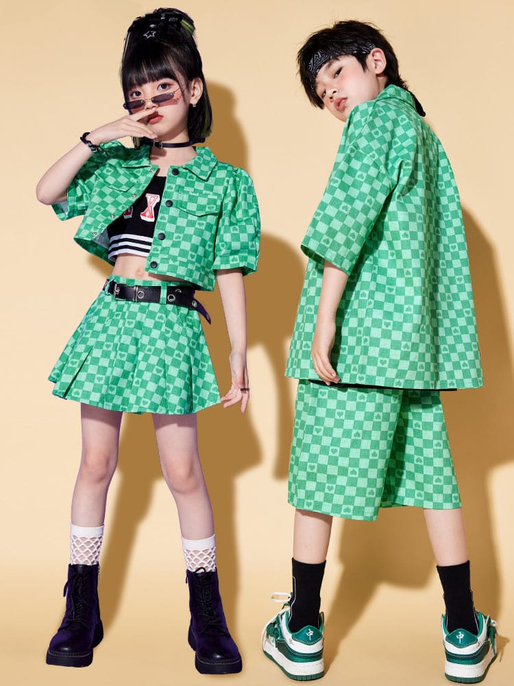チェック ジャズダンス ピンク レッド イエロー グリーン 団体服 応援団 発表会 hiphop K-POP 韓国 子供服 キッズダンス衣装 ステージ衣装 舞台装 半袖 シャツ パンツ スカート セットアップ 上下セット 女の子 男の子 ジュニア おしゃれ かっこいい 派手