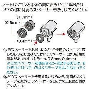 セキュリティスロットに簡単取付け。一体型、邪魔にならない小型スリムタイプのノートPC用セキュリティ。ノートパソコンセキュリティの特長●錠とワイヤーが一体型なので、邪魔になりません。●シリンダーが小さいので、薄型のノートパソコンでも取り付けが可能です。●移動が多い方に最適な着脱簡単タイプです。●取り付けの際、緩みが生じる場合は、付属のスペーサー(3サイズ)を使用して、しっかり取付けることができます。●別途マスターキーをお求めいただければ、複数のパソコンを一つの鍵で管理できます。※別途ご相談ください。<使用方法>1.ワイヤーを机の脚などに巻き付けます。2.ノートパソコンのセキュリティスロットへ本体の錠の金具を差し込みます。3.錠のボタンを押して、セキュリティスロットに金具を引っかけます。これで取り付け完了です。<開錠方法>鍵を錠の穴に合わせて差し込み右回りに回転すれば開錠されます。ノートパソコンセキュリティの商品仕様■セット内容:本体×1鍵×2スペーサー×3(厚み3種類、各1個)■サイズ:ワイヤー長/2.0mワイヤー直径/4.2mmスペーサー/厚み1.6mm、0.8mm、0.4mm■シリンダサイズ:W26×H27mm直径/18.5mmノートパソコンセキュリティの対応機種-メーカー名サンワサプライ商品名ノートパソコンセキュリティ商品型番SL-31SJANコード4969887287057ジャンルアクセサリ >> セキュリティ >> ノートパソコンセキュリティ※記載された製品の価格、仕様、サービス内容及び企業情報などは発表日現在のものです。※最新の情報に関しましては、メーカーサイトにてご確認ください。