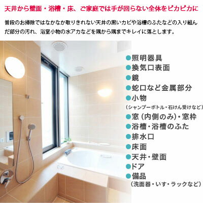 『同時注文可能な商品』はこちらをご確認ください。 浴室は、湯アカや石けんカス、皮脂汚れ、カビなど、手に負えない複合した汚れのたまりやすい場所。汚れの特性を見きわめ、状態に合わせてクリーニングします。壁や天井の黒カビ、浴槽・蛇口の湯アカ、排水口のヌメリもすっきり。 所要時間(目安):約1時間30分〜2時間(浴室1室) ※床面積3平方メートル未満、天井高さ2.4m未満の浴室が対象です。 【浴室クリーニングのお掃除箇所】 浴槽・浴槽フタ、蛇口など金属部分、排水口、床面・天井・壁面、ドア、照明器具、小物(洗面器・シャンプーボトルなど)、窓(内側のみ)、鏡、換気口表面、照明器具など ※「浴槽エプロン内部」と「浴室暖房乾燥機(換気扇)内部」は除く。 【おすすめポイント】 ●あらゆる機種への対応 常に最新の機種や素材に対してもしっかり汚れを落とすためのトレーニングを行いクリーニング技術の向上をはかっています。 ●専用の薬剤・資器材 素材は傷めず、キレイに汚れを落とす薬剤や資器材を利用して徹底洗浄を行います。 ※サービスカーの駐車スペースのご用意をお願いします。駐車できない場合は有料駐車場を利用するため、駐車料金をご負担いただきます。 その他の「よくある質問」はこちらをご確認下さい。 ※画像は全てイメージです。注意!ギフトカードとお掃除サービスは、同時に購入できません。それぞれ別々にご購入手続きをお願い致します。