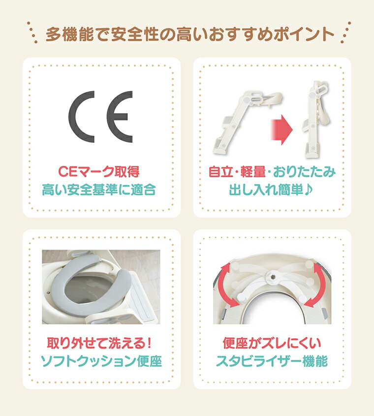 商品名 自立式折りたたみ補助便座 対象年齢 2才以上〜 耐荷重 約20kg カラー ホワイト 本体サイズ 幅 約37cm×奥行き約22cm×高さ約60cm 本体重量 約1.3kg 箱サイズ 幅35.5cm×奥行き39cm×高さ11cm 梱包重量 約1.85kg 材質 ポリプロピレン 商品組立 工具不要で簡単組立/同梱物のみで組立可能 生産国 中国 特徴 ■CEマーク取得済みの安全性の高いトイレステップ ■柔らかく取り外して洗える便座 ■PUソフトクッションは快適な座り心地で耐摩耗、防水、防汚+すべりにくい ■コンパクトに折りたためて1.35kgと軽量。出し入れや収納が簡単 ■便座スタビライザー付きでガタつかず、安定した使用感 ■工具不要で簡単組立 ■丈夫なPP製で耐久性があり、拭き取り可能で衛生的 ■丸みを帯びた持ち手、すべり止めなど使いやすいデザイン ■エコフレンドリーな素材 備考 ・取り扱い説明書をよく読んでから組立/ご使用をお願いします。 ・デザイン、色柄、仕様は品質向上などのため予告なく変更することがあります。 ・商品の色調は実物と多少異なる場合があります。 製品につきましての詳細は大変お手数ではございますが 下記までお問い合せ下さいませ。 【株式会社中塚小児車工業所】 電話 TEL 079-298-2279 FAX 079-292-6026 ★他のネビオ商品はこちらから★ → Nebio