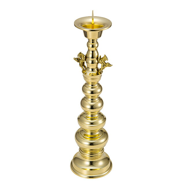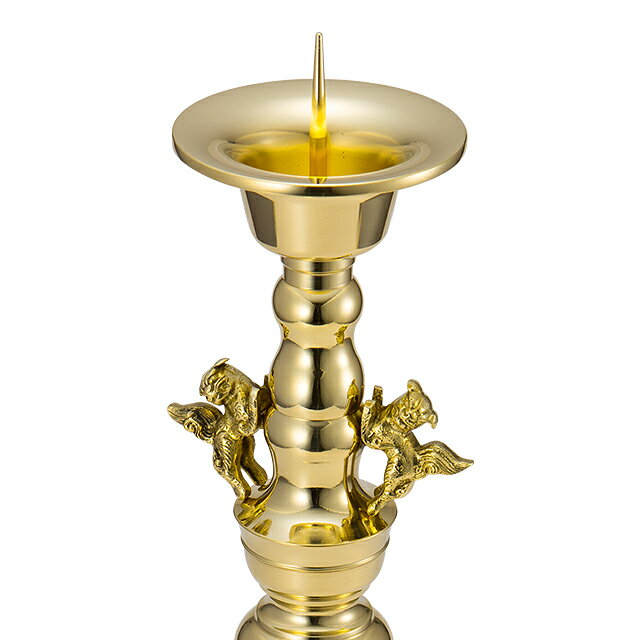 寸法:高さ46cm×底径12.6cm×火皿径10cm材質:真鍮製、磨き仕上げ生産地:日本製(富山県高岡製)備考:1個の価格です寺院用、大型の獅子掛中口(ししがけちゅうぐち)火立(ローソク立て)です。獅子の彫りが掛けてある伝統的なデザインです。獅子は固定されておりません。本堂の前机や須弥壇、位牌段などに置いて使用します。※ 火立の高さは火皿までの高さになります。商品説明寸法高さ46cm×底径12.6cm×火皿径10cm材質真鍮製、磨き仕上げ生産地日本製(富山県高岡製)備考1個の価格です寺院用、大型の獅子掛中口(ししがけちゅうぐち)火立(ローソク立て)です。獅子の彫りが掛けてある伝統的なデザインです。獅子は固定されておりません。本堂の前机や須弥壇、位牌段などに置いて使用します。熟練の職人によって丹精込めて造られる格調高い高岡銅器の仏具です。◆ 高岡銅器 ◆400年の伝統を誇る高岡銅器は、原型づくり→鋳造→仕上げ加工→着色または磨き加工という細かい工程をたどりつくられます。どの工程においても、熟練した職人が手技の粋を発揮し、それらが連携することにより1つの造形美が生まれます。鋳造工程では、溶けた金属の温度を「目で測る」ほどの長年培った熟練度が要求されます。伝統と気品に満ち溢れた高岡銅器は、贈答品としても大変喜ばれています。※ 火立の高さは火皿までの高さになります。