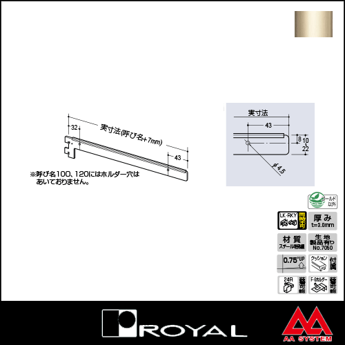 商品名 ロイヤル レベルブラケット B-120 150 Aニッケルサテン 品番 ROYAL-B-120-150N サイズ 呼び名 150 (※実寸法:呼び名+7mm) 対応棚 ガラス棚用 厚み t=3.0mm 角度 0.75°UP 材質 スチール特殊鋼 表面 ニッケルサテン 付属品 この商品にはクッションが付属されております 納期 通常1〜2営業日ほどで発送可能です 返品・交換 こちらの商品は返品・交換が不可となります 備考 ・LK(※別売)とRKY(※別売)の同時使用は出来ません。 ・セフティホルダー(Fホルダー・Gホルダー)装着可能です。 ・SB-24用の24Rホルダー装着可能です。