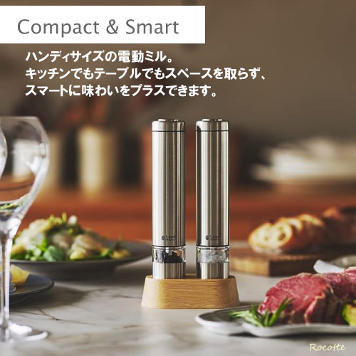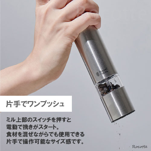 商品説明サイズ本体:幅3.5×奥行3.5×高さ18.5cm(約)スタンド込み:幅10.5×奥行5.5×高さ19.5cm重量200g (スタンド込み/450g)電源単四乾電池4本 (別売り) ※充電式乾電池不可 材質ステンレス、セラミック、PCTG樹脂、ABS(アクリロニトリル・ブタジエン・スチレン)樹脂 セット内容電動ミル(ミニ)2本、スタンド1個ブランドRussell Hobbs ラッセルホブス生産国 中国メーカー保証 1年間ご注意 ※乾電池は別売りです。充電池は使用できません。 ※食材の充填量はキャビン全体の8割程度までとなります。満量まで充填した場合、スムーズに挽けない場合があります。※ご使用いただける食材は粒の大きさが2~6mmの塩、胡椒、山椒、花椒、ハーブ等となります。ピンクペッパーやその他、水分・油分の多い食材はご使用いただけません。また、タイムやローズマリーは形状が細長いためご使用頂けません。※水洗い不可。電動ミル ソルト&ペッパー ミニ 7933JPRussel Hobbs ラッセルホブス片手で操作可能なコンパクトサイズハンディサイズの電動ミル。キッチンやテーブルに置いたままでもスペースを取らず、洗練された雰囲気に。片手で操作できるので、食材を混ぜながらでも手を休めずに使用できます。セラミック刃でお好み挽き方に錆の心配がなく、岩塩にも使用できる丈夫なセラミック製の刃を使用。摩擦熱が生じにくいため、熱で飛びやすい胡椒の香りを保ちます。また、底部のツマミを回転させて無段階に挽き加減を調整可能です。リニューアル旧製品からリニューアルした点は・立体的で押しやすくなったボタン・食材を多く入れられるよう容量25%UP・1年間のメーカー保証付帯ますます使い勝手がよく、挽きたて調味料の美味しさやお料理をお楽しみ頂けます。
