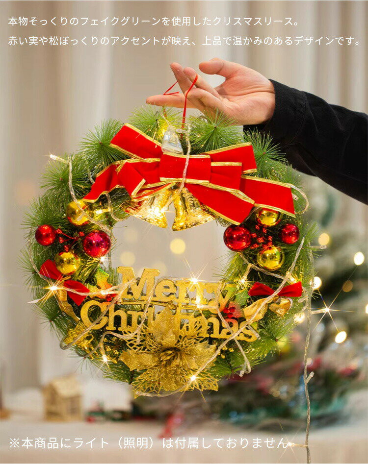 サイズ 直径:30/40/50/60cm商品説明 本物のような質感のフェイクグリーンを使用したクリスマスリース。 松ぼっくりや白い実の装飾が映え、上品でナチュラルな印象を演出します。 玄関ドアやリビング、ショップのディスプレイにも最適。 30cm・40cm・50cm・60cmの4サイズからお選びいただけます。 ※本商品にライト(照明)は付属しておりません。 ※一部のタイプ(例:Dタイプ)は輸送中の振動により、人工雪がわずかに落ちる場合がございます。あらかじめご了承ください。 ・サイズについて商品によっては、多少の誤差がある場合がございます。 ・商品の性質上、若干の汚れや色むら等が生じる場合がございます。 ・サイズ・重量は、多少の誤差が生じる場合がございます。 ・お使いのブラウザやモニターの設定により、画像と実際の商品との若干の色の違いが生じる場合がございます。 ・不良品の場合、評価からお伝え頂きましてもご対応できかねます。必ずメールにてご連絡をお願い致します。在庫がある場合は早急に新しいものと交換させて頂きます。素材 スチール+PVC生産国 CHINA注意事項 ※海外製品の為、実寸が多少異なる商品も御座います。 1、PC環境・光の具合により、色や素材のイメージが写真と若干異なる場合がございます。 2、注文確認後、キャンセル不可となっております。 予めご了承くださいますようお願い致します。 3、商品の仕様は改良等のため予告なく変更する場合があります。また本サイトの写真とお届け商品の色合いが多少異なる場合や、制作の都合上、柄などの出方が写真と異なる場合がございますので、ご了承下さい。サイズ 直径:30/40/50/60cm商品説明 本物のような質感のフェイクグリーンを使用したクリスマスリース。 松ぼっくりや白い実の装飾が映え、上品でナチュラルな印象を演出します。 玄関ドアやリビング、ショップのディスプレイにも最適。 30cm・40cm・50cm・60cmの4サイズからお選びいただけます。 ※本商品にライト(照明)は付属しておりません。 ※一部のタイプ(例:Dタイプ)は輸送中の振動により、人工雪がわずかに落ちる場合がございます。あらかじめご了承ください。 ・サイズについて商品によっては、多少の誤差がある場合がございます。 ・商品の性質上、若干の汚れや色むら等が生じる場合がございます。 ・サイズ・重量は、多少の誤差が生じる場合がございます。 ・お使いのブラウザやモニターの設定により、画像と実際の商品との若干の色の違いが生じる場合がございます。 ・不良品の場合、評価からお伝え頂きましてもご対応できかねます。必ずメールにてご連絡をお願い致します。在庫がある場合は早急に新しいものと交換させて頂きます。素材 スチール+PVC生産国 CHINA注意事項 ※海外製品の為、実寸が多少異なる商品も御座います。 1、PC環境・光の具合により、色や素材のイメージが写真と若干異なる場合がございます。 2、注文確認後、キャンセル不可となっております。 予めご了承くださいますようお願い致します。 3、商品の仕様は改良等のため予告なく変更する場合があります。また本サイトの写真とお届け商品の色合いが多少異なる場合や、制作の都合上、柄などの出方が写真と異なる場合がございますので、ご了承下さい。