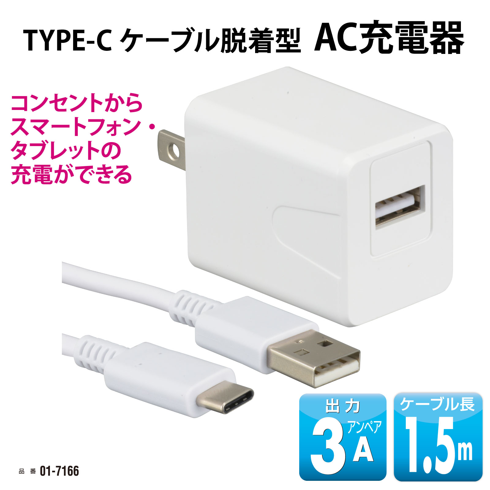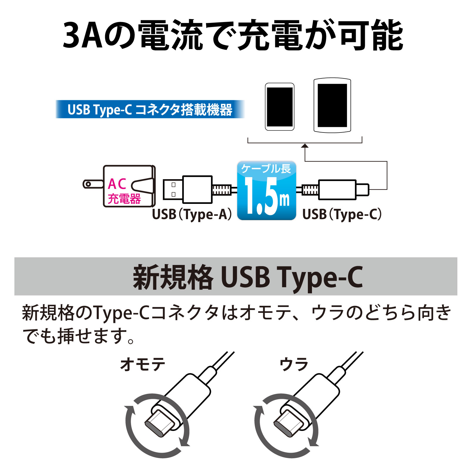 【 特 長 】 ● コンセントからスマートフォン・タブレットの充電ができる ● USB Type-Cコネクタ搭載機器対応 ● USB Type-Cケーブル脱着型 ● 3Aの高出力で超急速充電 【 仕 様 】 ≪ケーブル≫ ■ コネクター形状:USB Type-A/USB Type-C ■ ケーブル長:約1.5m ■ 質量:約53g ≪AC充電器≫ ■ 定格入力電圧:AC100-240V 50/60Hz 0.5A(MAX) ■ 定格出力電圧:USB TYPE-A 5V ■ 定格出力電流:3A ■ 本体外形寸法:(約)幅44×高さ35×奥行30mm ■ 質量:約47g ■ 対応機種:スマートフォン/タブレットなどのUSB Type-Cコネクタ搭載機器