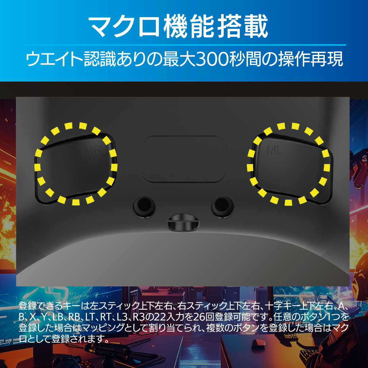 【 特 長 】 ● 有線接続 USB Type-A ● ボタン数 21、マクロボタン(ML/MR)付き ● RGBバックライト ● 振動レベル…100%/60%/0%の3段階調整 ● マクロ機能搭載…ウエイト認識ありの最大300秒間の操作再現(本体保存) ● トリガーストローク調整…2段階トリガーでゲームに応じて使い分け可能 ● ホールエフェクトトリガー…磁力非接触方式なので確実な操作性と高い耐久性を両立 【 仕 様 】 ■ 対応機種:Windows10(64bit)、Windows11(64bit)、NintendoSwitch、Android ■ ボタン数:21 ■ 接続方式:USB2.0 ■ 振動機能:あり(3段階調整100%/60%/0%) ■ 連射機能:あり(3段階調整) ■ マクロ機能:あり(2ボタン) ■ 外形寸法:(約)幅150×高さ105×奥行40mm ■ ケーブル長:1.8m ■ 質量:290±5g ■ 電圧/電流:5V/200mA ■ 動作環境:0℃〜45℃/動作湿度 20〜80% ※ただし結露なきこと ■ 保管環境:-10℃〜60℃/保存湿度 20〜80% ※ただし結露なきこと ■ 付属品:保証書付取扱説明書