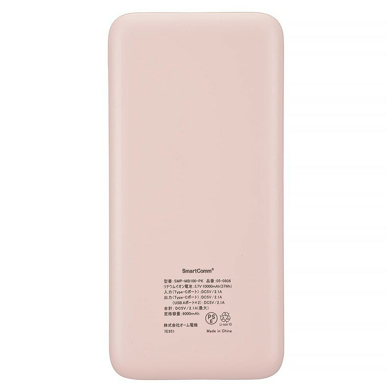 SmartComm モバイルバッテリー 軽量 小型 大容量 10000mAh USB A 出力 Type-C 出力 シュガーピンク PSE届出事業者直販 スマホ充電 防災グッズ 停電|SMP-MB100-PK 05-0806 オーム電機
