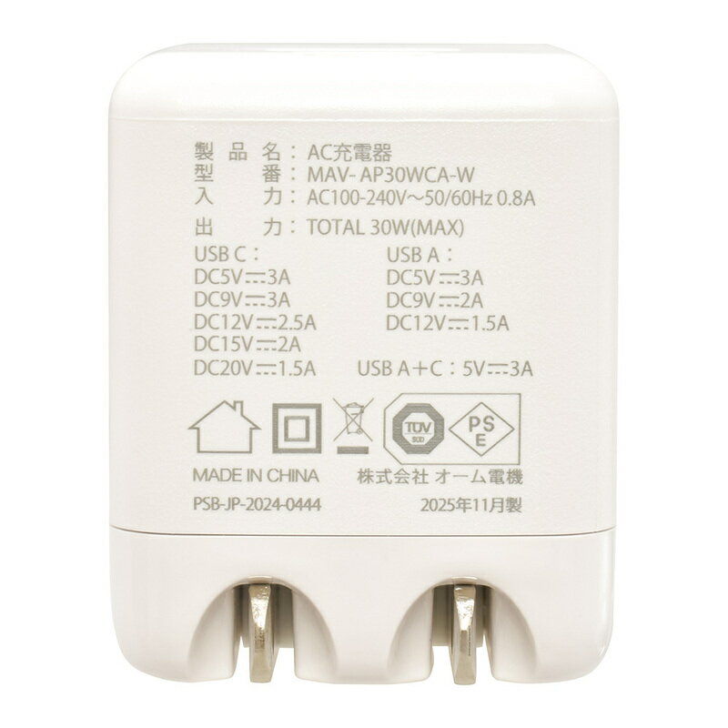 【 特 長 】 ● お手持ちのUSBケーブルで家庭用コンセントからiPhone/スマートフォン/タブレットの充電が2台同時にできる、USB2ポートのAC充電器 ● USB Type-CポートはUSB Power Delivery(USB PD)の急速充電規格に対応 ● USB Type-AポートはQuick Charge 3.0(QC3.0)の急速充電規格に対応 ● 出力電圧を接続する機器に合わせて自動で切り換え、最適な電力で安全に給電 ※非対応の機器の場合、最大出力3A相当(端末に依存する)で給電 ● 高出力で超急速充電 ● 充電時間50分で約70%充電 ※iPhone16 ProMaxの場合(オーム電機調べ) ● 折りたたみ式プラグ 【 仕 様 】 ■ 定格入力:AC100-240V 50/60Hz 0.8A(MAX) ■ 定格出力:30W(MAX) ■ USB Type-C:DC5V直流3A、DC9V直流3A、DC12V直流2.5A、DC15V直流2A、DC20V直流1.5A ■ USB Type-A:DC5V直流3A、DC9V直流2A、DC12V直流1.5A ■ 出力端子:USB Type-C×1、USB Type-A×1 ■ 本体外形寸法:(約)幅33×高さ41×奥行33mm ■ 質量:約48g ≪ご注意≫ ※ USBケーブルは付属しておりません。別途、お使いの機器に対応したUSBケーブルをご用意ください。 ※ 2台同時に接続した時は、PD/QC機能に対応しません。