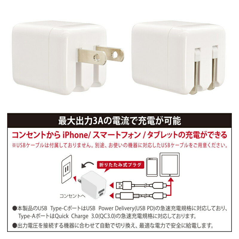 AudioComm AC充電器 ACアダプター 定格出力 30W USB Type-C PD対応 USB Type-A QC対応 折りたたみ式プラグ PSE認証 Power Delivery Quick Charge|MAV-AP30WCA-W 01-7367