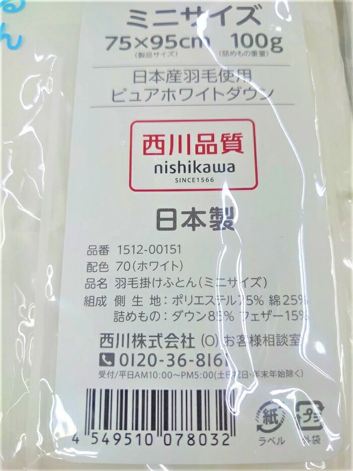 西川 ベビー 洗える 羽毛掛けふとん ミニサイズ 75×95cm ホワイト 日本製 151200151