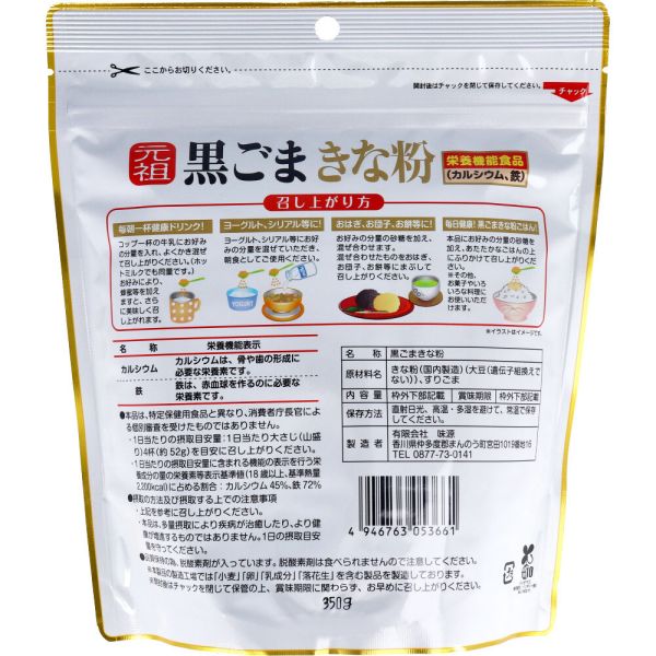 ギフトサービスについて有限会社味源個装サイズ:180X210X75mm個装重量:約375g内容量:350g【発売元:有限会社味源】【栄養機能食品(カルシウム・鉄)】【名称】黒ごまきな粉【原材料】きな粉(国内製造)(大豆(遺伝子組換えでない)、すりごま【栄養成分(1日52gあたり)】エネルギー:253kcaLたんぱく質:15.8g脂質:19.3g炭水化物:12.8g-糖質:3.8g-食物繊維:9.0g食塩相当量:0.0gカリウム:750mgカルシウム:310mg鉄:4.9mgナイアシン:2.3mgビタミンB1:0.04mg【召し上がり方】★毎朝一杯健康ドリンクコップ1杯の牛乳にお好みの分量を入れ、よくかき混ぜて召し上がりください。(ホットミルクでも同量です。)お好みにより蜂蜜等を加えますと、さらに美味しく召し上がれます。★ヨーグルト、シリアル等にヨーグルト、シリアル等にお好みの分量を混ぜて頂き、朝食としてご利用ください。★おはぎ、お団子、お餅等にお好みの分量の砂糖を加え、混ぜ合わせます。混ぜ合わせたものをおはぎ、お団子、お餅にまぶして召し上がりください。★毎日健康、黒ごまきな粉ごはんお好みの分量の砂糖を加え、あたたかなご飯の上にふりかけて召し上がりください。★その他、お菓子やいろいろな料理にお使いいただけます。【保存方法】直射日光、高温・多湿を避けて、常温で保存してください。【注意】・本品は、特定保健用食品とは異なり、消費者庁長官による個別審査を受けたものではありません。・1日当たり大さじ(山盛り)4杯(約52g)を目安にお召し上がりください。・1日当たりの摂取目安量に含まれる機能の表示を行う栄養成分の量の栄養素等表示基準値(18歳以上、基準熱量2200kcaL)に占める割合:カルシウム 45%、鉄 72%・本品は多量摂取により疫病が治癒したり、より健康が増進するものではありません。1日の摂取目安量を守ってください。・品質保持の為、脱酸素剤が入っています。脱酸素剤は食べられませんので注意してください。※本製品製造工場では小麦・卵・乳成分・落花生を含む製品を製造しております。・開封後はチャックを閉じて保管の上、賞味期限に関わらずお早めにお召し上がりください。・食生活は、主食、主菜、副菜を基本に、食事のバランスを。商品特徴一覧food、kaneishiaward1220、4946763053661、通信販売、通販、販売、買う、購入、お店、売っている、ショッピング【元祖 黒ごまきな粉 350g】広告文責(有)イースクエアTEL:0120-532-772有限会社味源個装サイズ:180X210X75mm個装重量:約375g内容量:350g【発売元:有限会社味源】【栄養機能食品(カルシウム・鉄)】【名称】黒ごまきな粉【原材料】きな粉(国内製造)(大豆(遺伝子組換えでない)、すりごま【栄養成分(1日52gあたり)】エネルギー:253kcaLたんぱく質:15.8g脂質:19.3g炭水化物:12.8g-糖質:3.8g-食物繊維:9.0g食塩相当量:0.0gカリウム:750mgカルシウム:310mg鉄:4.9mgナイアシン:2.3mgビタミンB1:0.04mg【召し上がり方】★毎朝一杯健康ドリンクコップ1杯の牛乳にお好みの分量を入れ、よくかき混ぜて召し上がりください。(ホットミルクでも同量です。)お好みにより蜂蜜等を加えますと、さらに美味しく召し上がれます。★ヨーグルト、シリアル等にヨーグルト、シリアル等にお好みの分量を混ぜて頂き、朝食としてご利用ください。★おはぎ、お団子、お餅等にお好みの分量の砂糖を加え、混ぜ合わせます。混ぜ合わせたものをおはぎ、お団子、お餅にまぶして召し上がりください。★毎日健康、黒ごまきな粉ごはんお好みの分量の砂糖を加え、あたたかなご飯の上にふりかけて召し上がりください。★その他、お菓子やいろいろな料理にお使いいただけます。【保存方法】直射日光、高温・多湿を避けて、常温で保存してください。【注意】・本品は、特定保健用食品とは異なり、消費者庁長官による個別審査を受けたものではありません。・1日当たり大さじ(山盛り)4杯(約52g)を目安にお召し上がりください。・1日当たりの摂取目安量に含まれる機能の表示を行う栄養成分の量の栄養素等表示基準値(18歳以上、基準熱量2200kcaL)に占める割合:カルシウム 45%、鉄 72%・本品は多量摂取により疫病が治癒したり、より健康が増進するものではありません。1日の摂取目安量を守ってください。・品質保持の為、脱酸素剤が入っています。脱酸素剤は食べられませんので注意してください。※本製品製造工場では小麦・卵・乳成分・落花生を含む製品を製造しております。・開封後はチャックを閉じて保管の上、賞味期限に関わらずお早めにお召し上がりください。・食生活は、主食、主菜、副菜を基本に、食事のバランスを。※お客さま都合による、ご注文後の[キャンセル][変更][返品][交換]はお受けできませんのでご注意下さいませ。※当店では、すべての商品で在庫を持っておりません。記載の納期を必ずご確認ください。※ご注文いただいた場合でもメーカーの[在庫切れ][欠品][廃盤]などの理由で、[記載の納期より発送が遅れる][発送できない]場合がございます。その際は、当店よりご連絡させていただきます。あらかじめご了承