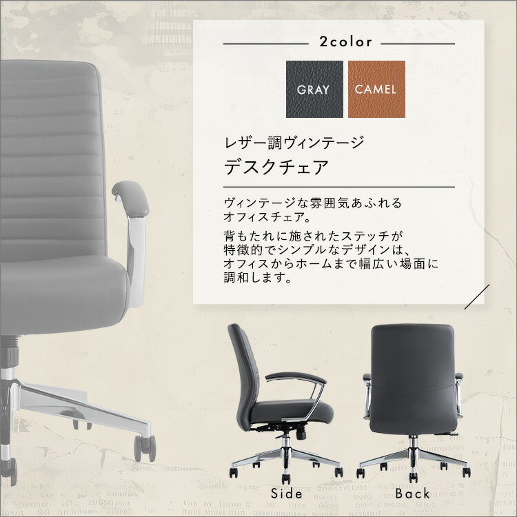 《HOMEtaste》レザー調 ヴィンテージ デスクチェア Granst 昇降 回転 キャスター付き ロッキング 高さ調節 高さ調整 肘付き オフィスチェア パソコンチェア PCチェア 椅子 いす おしゃれ モダン レトロ 合成皮革 店舗 法人 キャメル グレー km-lcv