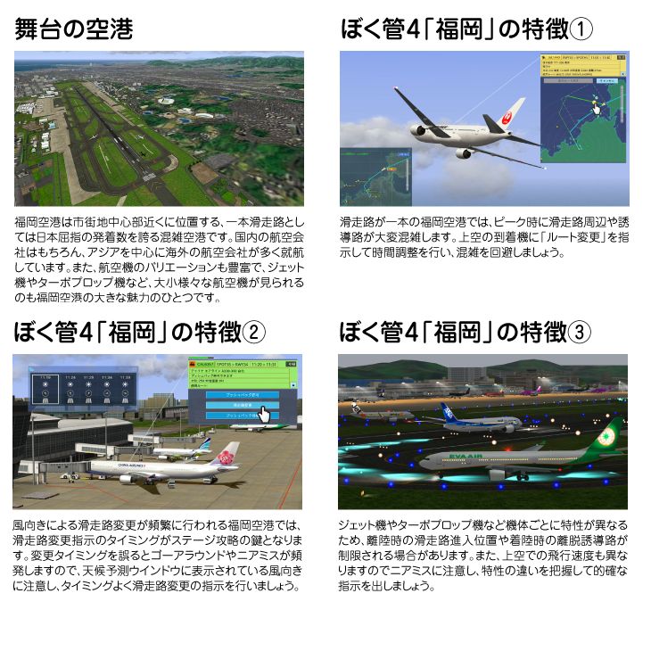 テクノブレインぼくは航空管制官4福岡WTLF-0031ぼく管4シリーズ第三弾は混雑空港「福岡」!到着便の時間調整が地上の混雑状況を左右する!ぼく管4シリーズ第三弾、舞台は九州の拠点空港「福岡」!市街地からほど近い立地と、一本滑走路としては屈指の離着陸回数を誇る空港です。福岡空港には海外の航空会社が多く就航しており、航空機のバリエーションも華やかで、ジェット機やターボプロップ機など、大小様々な航空機が見られるのも大きな魅力のひとつです。本作では混雑する地上と空域をリアルに再現。到着便の時間調整が地上の混雑状況を左右します。より自由度の高くなった上空の「ルート変更」を駆使してトラフィックを調整し、安全な運航を目指しましょう!【発売日】2017年01月20日【仕様】対応OS:64ビット Windows 7 / 8 / 8.1 / 10 日本語版(RT版を除く)動作CPU:定格 2.4GHz以上 (Core i シリーズ以上)動作メモリ:6GB以上動作HDD容量:空き容量3GB以上その他動作条件: グラフィック:DirectX9以降に対応したもの・NVIDIA GeForce GTX シリーズ、および同等性能以上のAMD Radeonシリーズ・INTEL HD Graphics 4000以上の性能。ビデオメモリ:1G以上。インターネット:常時接続可能なインターネット環境。サウンド:DirectXサウンド対応。ディスプレイ:1366x768以上。入力装置:マウス、キーボード。インストール時にはインターネット環境、およびユーザ登録が必須です。