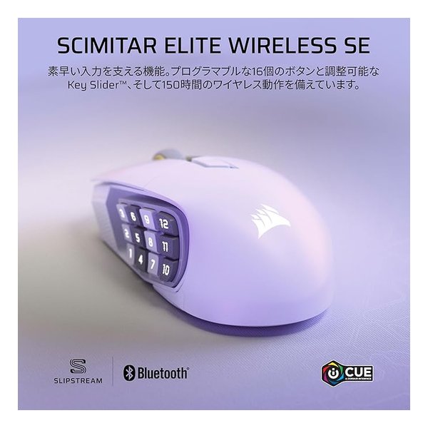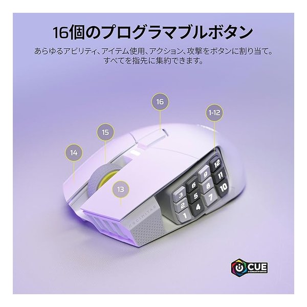 ●驚異的な正確さの 33k DPI MARKSMAN SMARKSMAN S 33k DPI 光学式センサーのおかげで、ヘッドショット、マップ全体のスキャン、チームメイトへのピン送信など、すべてが驚くほどの精度で行えます。DPI 検出の改善、IPS トラッキング、そして消費電力が旧バージョンより低くなり、間違いなくアップグレードに値します。●16 個のプログラム可能なボタン世界中のすべてのパワーを、あなたの指先一つで。16 個のプログラム可能なボタンで、パワー、消耗品、アクション、攻撃ごとにボタンを用意しましょう。●どんなサイズの手にも快適特許取得の Key Slider を調整することで、12 個のボタンが親指にぴったり合う位置になります。マウスの輪郭により、グリップが快適になり、手首の負担を軽減します。●高速低遅延ワイヤレスで自由にコードが不要になり、ラグもなくなります。SLIPSTREAM WIRELESS は、標準的なワイヤレスマウスの最大 2 倍高速の 1.000Hz ハイパーポーリングで、PC または Mac で応答速度 1ms 以下の接続を実現します。代わりに Bluetooth に接続したり、USB に接続してプレイしながら充電することもできます。●最長 150 時間ワイヤレス接続バッテリー駆動1 回の充電で最長 150 時間のレイド、グラインド、略奪を楽しめて、バッテリーの心配はもうありません。わずか 90 分以内で完全に充電できます。●光速の光学式スイッチ左右クリック用の光学式スイッチにより、デバウンス遅延がなくなり、驚くほどのスピードでアタックできるようになります。●100% PTFE マウスソール超低摩擦の 100% PTFE パッドで作られたマウスソールは、スムーズに滑ります。●3つのプロファイルを保存できるオンボードメモリ設定を持ち運べて、最大 3 つのプロファイルの DPI 設定、マクロ、RGB ライティングをマウスに直接保存できます。●iCUE でマウスをカスタマイズ強力な CORSAIR iCUE ソフトウェアで、RGB カスタマイズ、DPI 設定、ボタンマッピング変更、超高精度の表面調整などのロックを解除します。■サイズ:119.23×73.48×42.17 mm■重量:114 g■接続性:有線接続(USB 2.0 Type-A)■接続性:ワイヤレス接続(USB 2.0 Type-A ワイヤレスレシーバーで 2.4 GHzBluetooth 4.2 +LE)■バッテリータイプ:充電式リチウムポリマー内蔵■バッテリー寿命:2.4 GHz:最長 150 時間、Bluetooth:最長 500 時間 ※RGB をオフにして 2.4 GHz ワイヤレスを使った場合は最長 150 時間、RGB をオフにして Bluetooth を使った場合は最長 500 時間。■センサー:CORSAIR MARKSMAN S(光学)■解像度(DPI):100 〜 33.000■ボタン:16■USB ポーリングレート(2.4Ghz ワイヤレス):125Hz、250Hz、500Hz、1000Hz (デフォルト)■USB ポーリングレート(USB 有線接続):125Hz、250Hz、500Hz、1000Hz (デフォルト)■マウスソール:PTFE