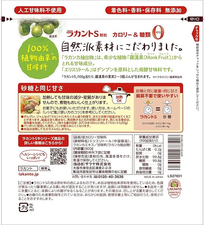 商品説明■ ラカントS原材料:エリスリトール(中国製造)、ラカンカエキス、甘味料(ラカンカ抽出物) 内容量:800g 商品サイズ(高さx奥行x幅):20cm×5.5cm×18cm 商品紹介 ●ウリ科の植物「羅漢果」と発酵ブドウ糖「エリスリトール」からつくった、カロリー0の自然派甘味料です。 砂糖と同じ甘さでカロリー0! 糖尿病、肥満症の方に。 契約栽培羅漢果。収穫の度に担当者が現地を訪問し、品質を確認した高純度羅漢果エキスを使用しています。 加熱料理におすすめ! 加熱による甘味質の分解・味覚変化などを受けることのない原料だけを厳選していますので、加熱しても甘味が損なわれません。煮物にもおすすめです。 ●砂糖の代わりに使うだけで、大さじ1杯36kcalダウン。 原材料・成分 エリスリトール(中国製造)、ラカンカエキス、甘味料(ラカンカ抽出物)■ ラカントフローラビオ商品紹介 イヌリンの「整腸」と「食後血糖値上昇抑制」のW機能でおなか整う腸活シロップ。 原材料・成分 食物繊維(イヌリン)、マルチトールシロップ、イソマルトオリゴ糖シロップ、甘味料(ラカンカ抽出物)、保存料(ビタミンB1)