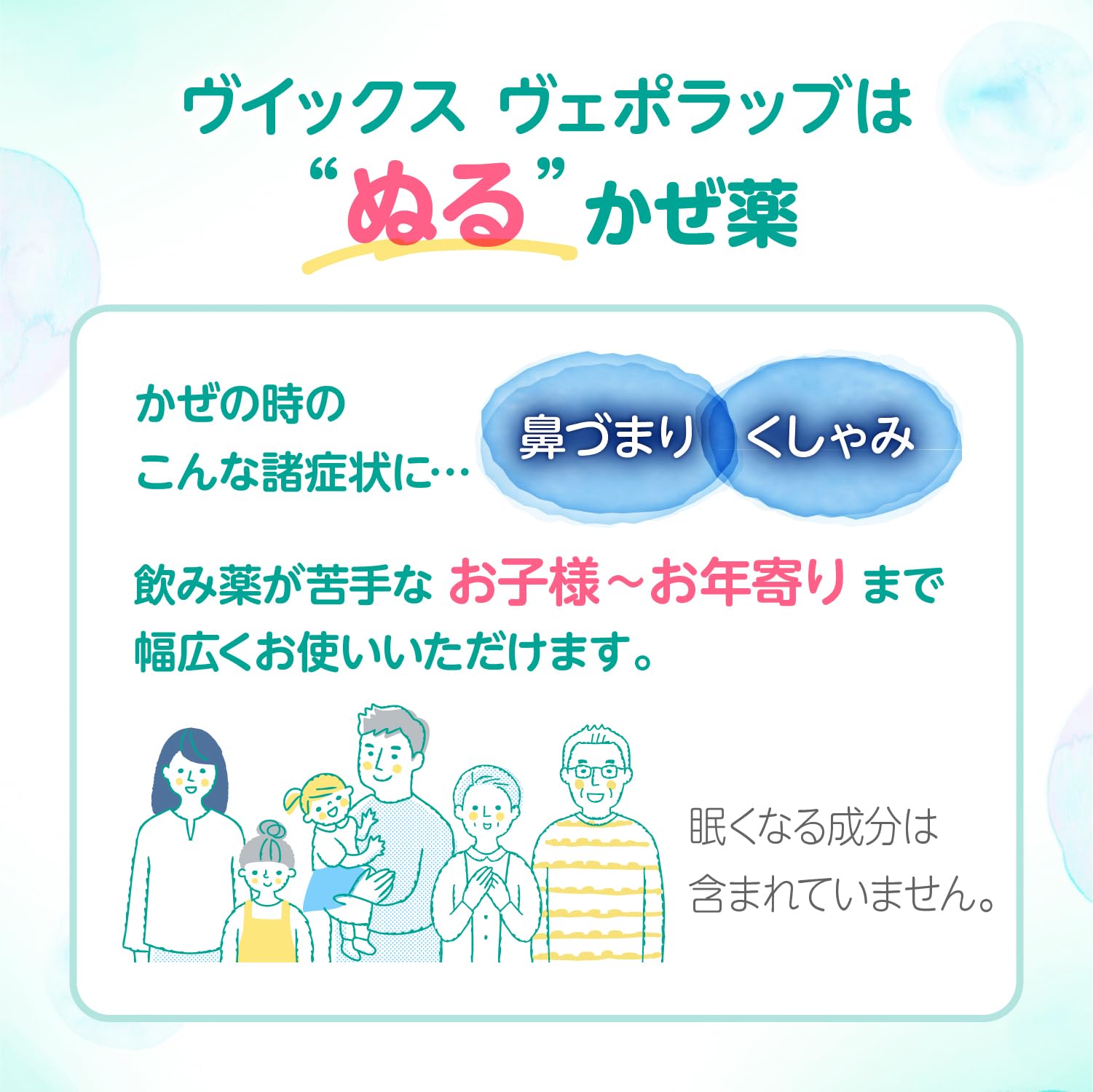 商品説明■ 成分100g中 dl-カンフル 5.26g、テレビン油 4.68g、lメントール 2.82g、ユーカリ油 1.33g、ニクズク油 0.69g、杉葉油 0.44g 添加物:チモール、ワセリン■ 効能・効果胸・のど・背中に塗ることで、鼻づまり、くしゃみなど、かぜに伴う諸症状を緩和します。 ■ 用法・用量胸・のど・背中に塗布、または塗布後布で覆ってください [年齢:1回量:使用回数] 12才以上:6〜10g:3回 6〜11才:5g:3回 3〜5才:4g:3回 6ヵ月〜2才:3g:3回 生後6ヵ月未満の乳児:使用しないこと (1)定められた用法・用量を守ってください (2)小児に使用させる場合には、保護者の指導監督のもとに使用させてください (3)目に入らないよう注意してください。万一、目に入った場合は、すぐに水またはぬるま湯で洗ってください。なお、症状が重い場合には、眼科医の診療を受けてください (4)ヴィックスヴェポラップは外用にのみ使用し、服用しないでください■ 保管及び取り扱い上の注意(1)直射日光の当たらない涼しい所に、ふたをよくしめて保管してください (2)小児の手の届かない所に保管してください (3)他の容器に入れ替えないでください(誤用の原因になったり品質が変わります) (4)使用期限を過ぎた製品は使用しないでください。なお、使用期限内であっても、開封後はなるべく早く使用して下さい(品質保持の為)